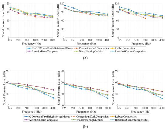 Sound pressure level with floor materials (a) before controlled and (b) after controlled at positions 1, 2, and 3.
