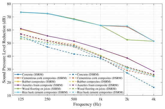Figure 18 presents types of composite materials having SPL reduction levels after using the 3D woven textiles. The mean SPL reduction of types of materials is taken after calculating the reduction of various 3 positions. It can be easily seen that the SSRM material combined with the above materials have SPL reduction less effective than DSRM material over the octave frequency range reaching the allowable threshold.