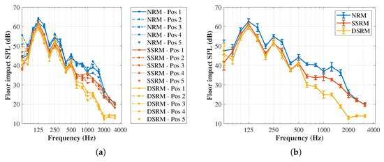 Experimental results at five different positions demonstrate a sharp decrease trend after 500 Hz frequency when using both with and without 3D woven textiles. Figure 19a indicates that SSRM test results follow similar trends in terms of frequency to non-3D reinforced textiles (NRM). In the instance of DSRM, it was discovered that the reduction of lightweight impact sound was good after 500 Hz, and it was proved that DSRM reduced by 13 dB when compared to traditional NRM material at 2 kHz. This demonstrates that DSRM (the arrangement of both ends of a 3D textile) has strong reduction properties in the intermediate and high frequency bands. This shows that there is a correlation between the aforementioned dynamic modulus and the lightweight impact sound. KW Kim (2009) [53] investigated the relationship between the dynamic modulus and the lightweight impact sound, and it was discovered that the lower the dynamic modulus, the greater the decrease in lightweight impact sound. As a result, NRM and SSRM had equal dynamic modulus values, resulting in a floor impact sound level similar to each other, whereas DSRM, which had a lower dynamic modulus than NRM and SSRM, produced a light impulse sound value. The effect of reducing lightweight impact sound can be improved if 3D woven textile is used in a high-frequency band. The reduction in noise transmission to the lower story of the different frequency band is described in detail with the improvement with increasing sheet thickness as shown in Figure 19b.
