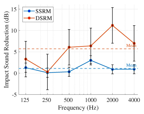 Comparison of impact sound attenuation caused by SSRM and DSRM sample.