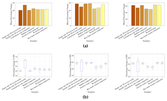 The paper examines the common materials incorporating 3D woven textile material in preventing noise from direct sound, as shown in Figure 21. The results show that The airborne noise reduction levels were different for 3D woven textiles with one or two layers (about 40% and 55%), compared to non-3D woven textile materials, as shown in Table 5. DSRM and other composites had a lower percentage reduction due to their low initial SPL. DSRM materials showed the most variation between measurement locations, with a higher 60% reduction percentage. Meanwhile, the remaining materials showed negligible change between locations, with variations ranging around 40% at 500 Hz. SSRM had a large change rate of roundly 60% at middle and high frequencies compared to the remaining materials. While auxetic foam and rubber composites witness a lower mean percentage reduction, wood flooring and rice husk cement composites decrease uniformly from 45% to 65% at multiple frequencies. This approach is a fast and effective solution for determining the level of noise, ensuring desired sound levels in rooms below 60 dB as required, and for improving sound insulation for composite materials, especially in the early design phase.
