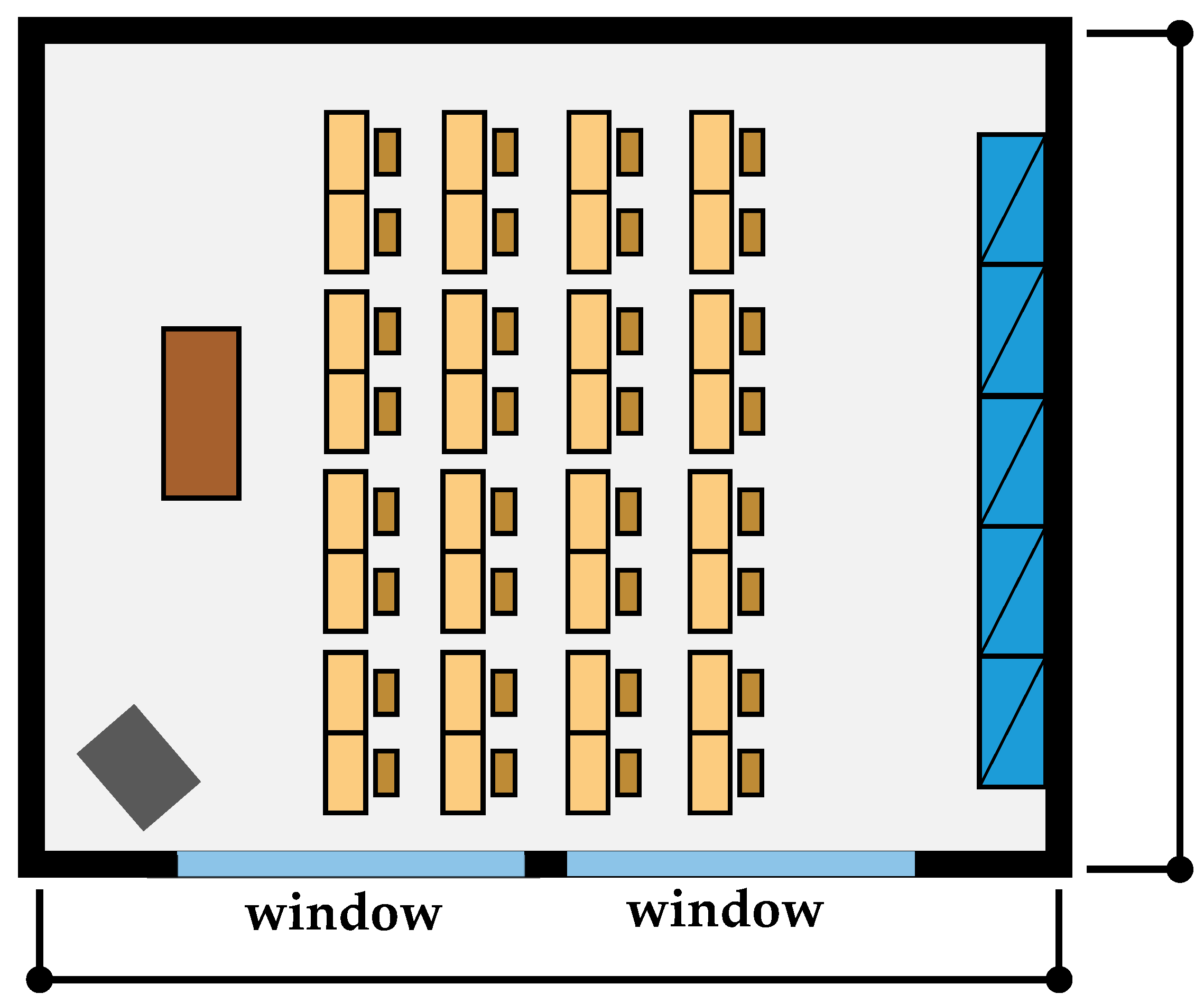 In this study, the classroom selected as the model represents the most common and typical classroom module in South Korea (Figure 1). Although educational facilities may vary according to different operators, such as private or public institutions, the vast majority of schools in South Korea are public and generally adhere to standardized classroom forms and dimensions developed by the Ministry of Education. These standardized classrooms are periodically upgraded in response to curriculum revisions. In this context, the classroom model selected for this study can be considered representative.