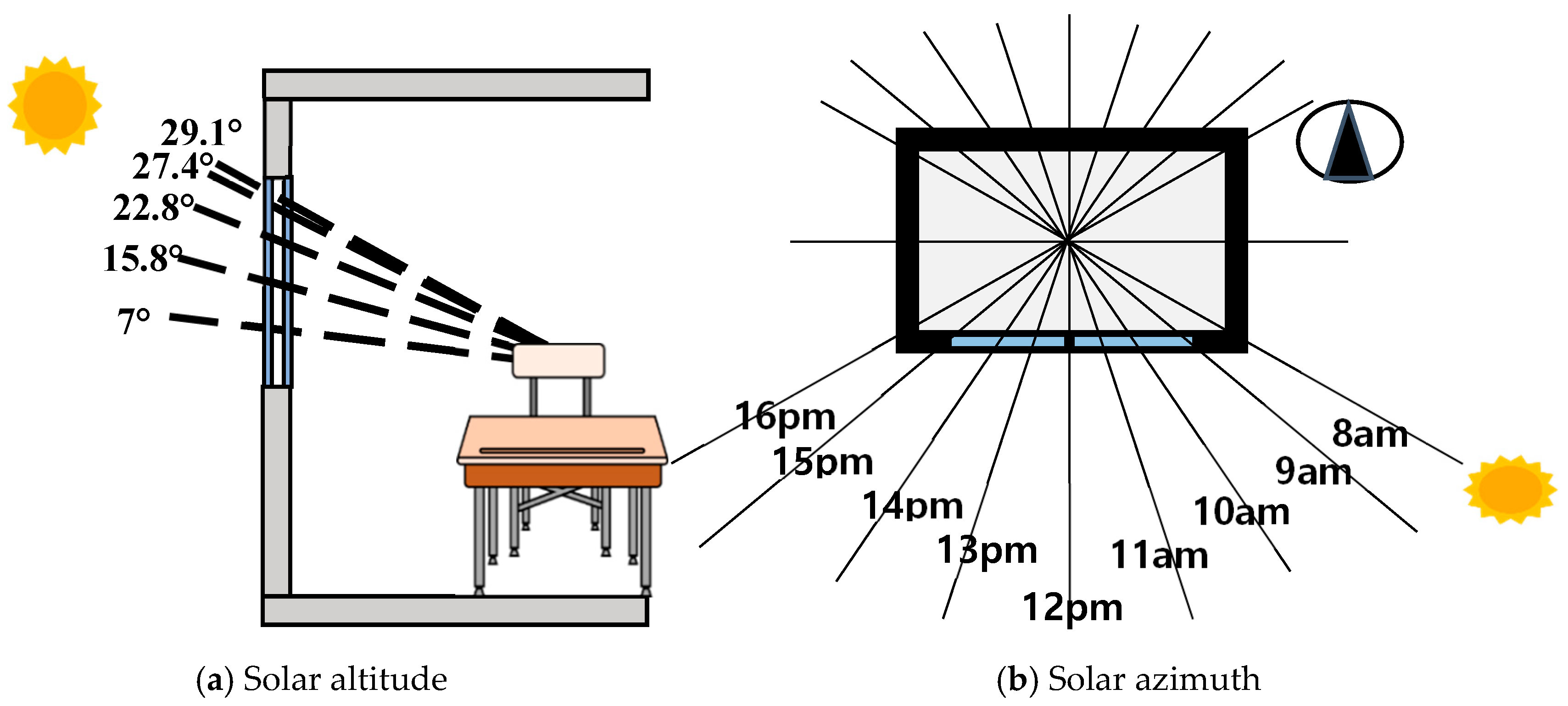 To evaluate sunlight access in school classrooms, a reference window was defined with dimensions of 3.0 m (width) × 1.8 m (height), with its bottom edge positioned at 0.8 m above the floor. The solar geometry was calculated for Seoul, where the solar altitude on the winter solstice reaches 7° at 8:00 a.m. and 29.1° at noon (Figure 2a), and the corresponding sun azimuth angles were determined based on true solar time (Figure 2b). These parameters were used to simulate the temporal variation in direct sunlight penetration into the reference classroom. By integrating obstructing building masses in the simulation, the study assessed the impact of blocked sunlight on indoor illuminance levels and associated lighting energy consumption, thereby quantifying the practical implications of sunlight rights violations under winter conditions.