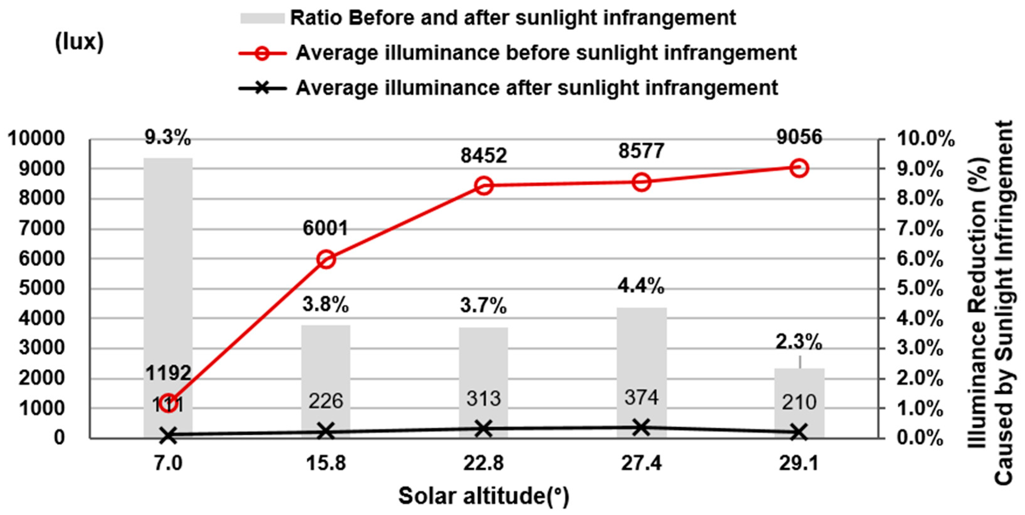 Before sunlight infringement, the maximum average illuminance was 9056 lux at a solar elevation of 29.1°. After infringement, the highest recorded illuminance was 374 lux at 27.4°, marking an 8682 lux reduction. At 29.1° elevation, the illuminance before infringement peaked at 9056 lux but dropped to 210 lux after infringement, a 97.7% decrease. The lowest illuminance after infringement occurred when the sun’s elevation was 7.0°, with a drop from 1192 lux to 111 lux, reflecting a 90.7% reduction (Figure 4).