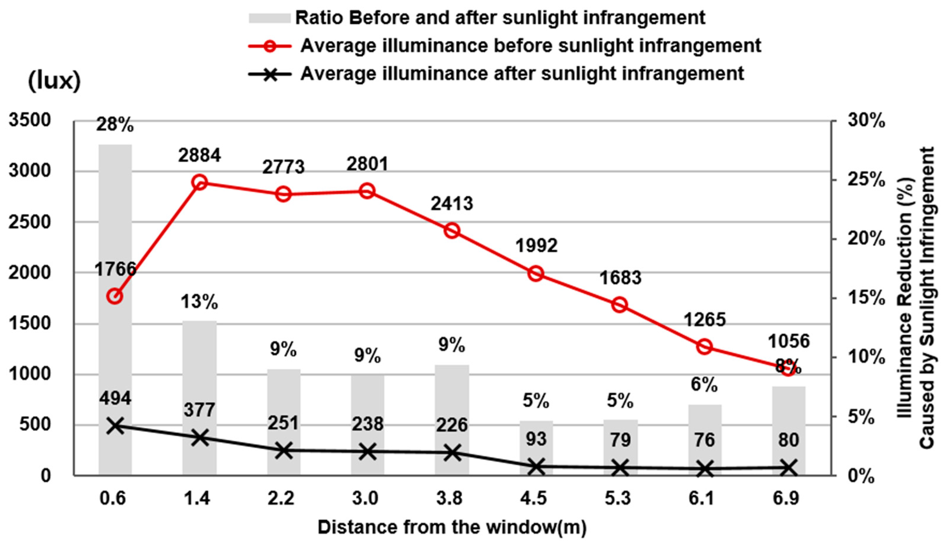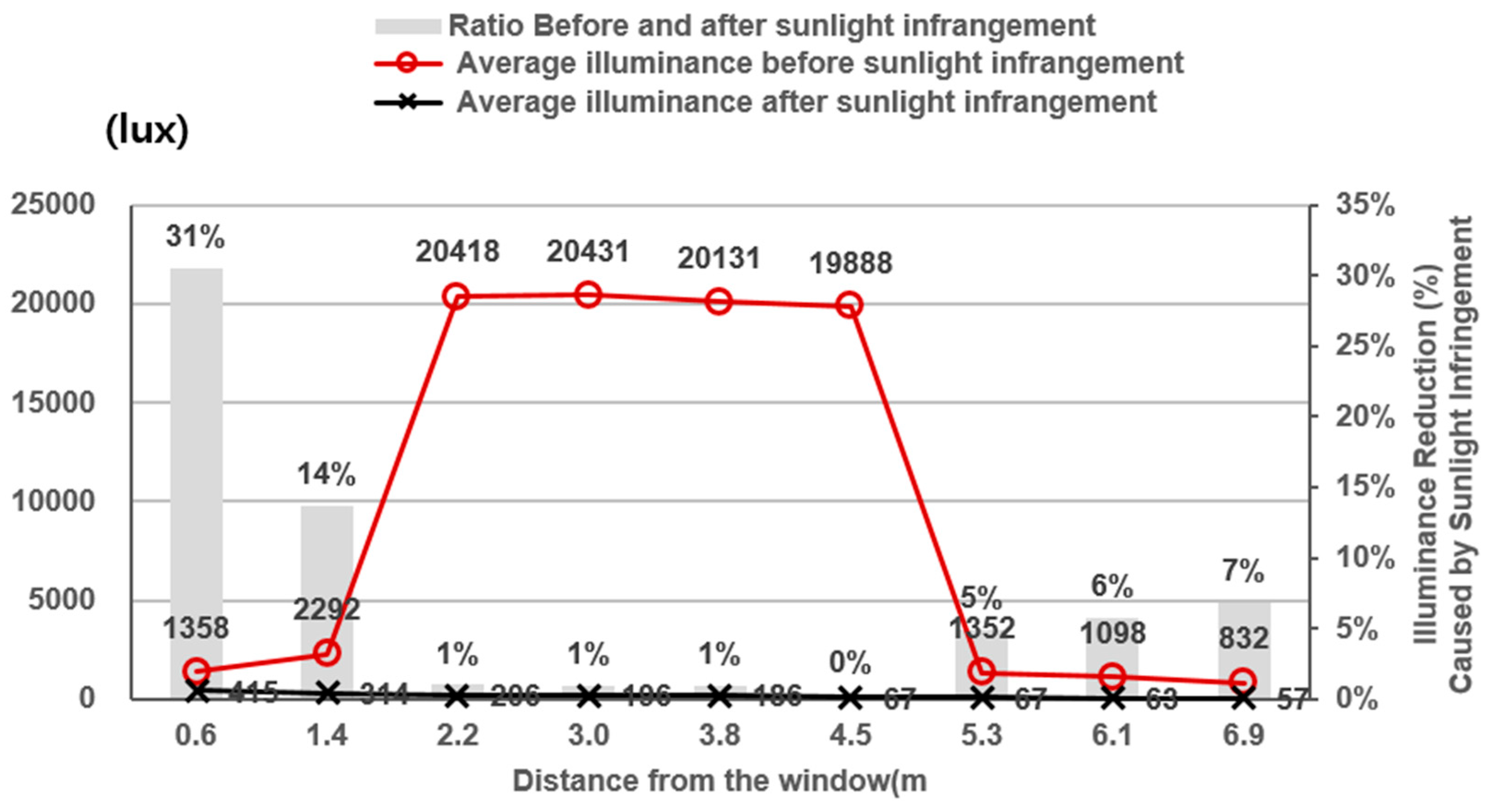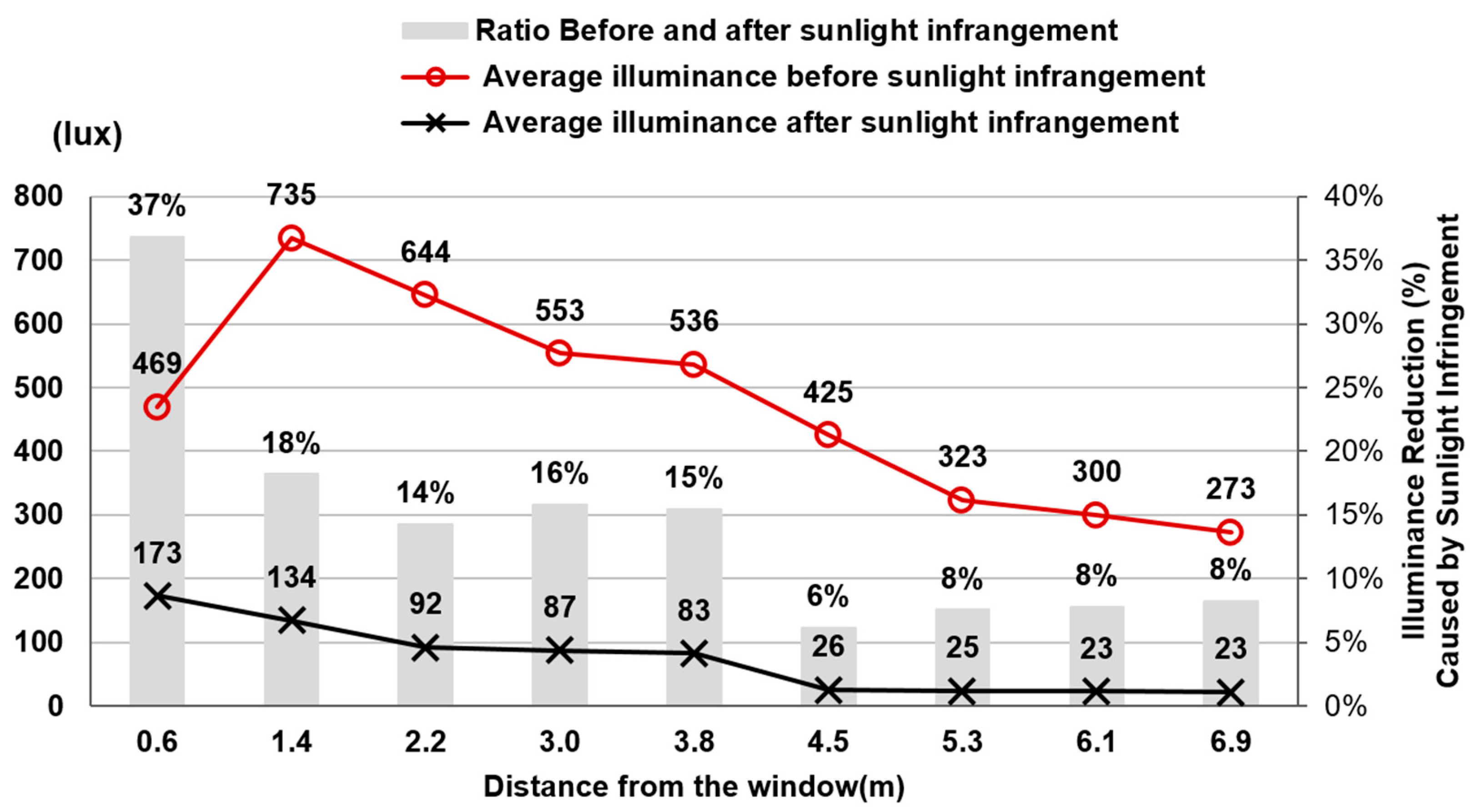 At a distance of 1.4 m from the window, the largest difference in illuminance before and after sunlight infringement was observed, measuring 601 lux. Conversely, at 6.9 m from the window—where both pre- and post-infringement illuminance values were lowest—the difference was minimal, at 250 lux.