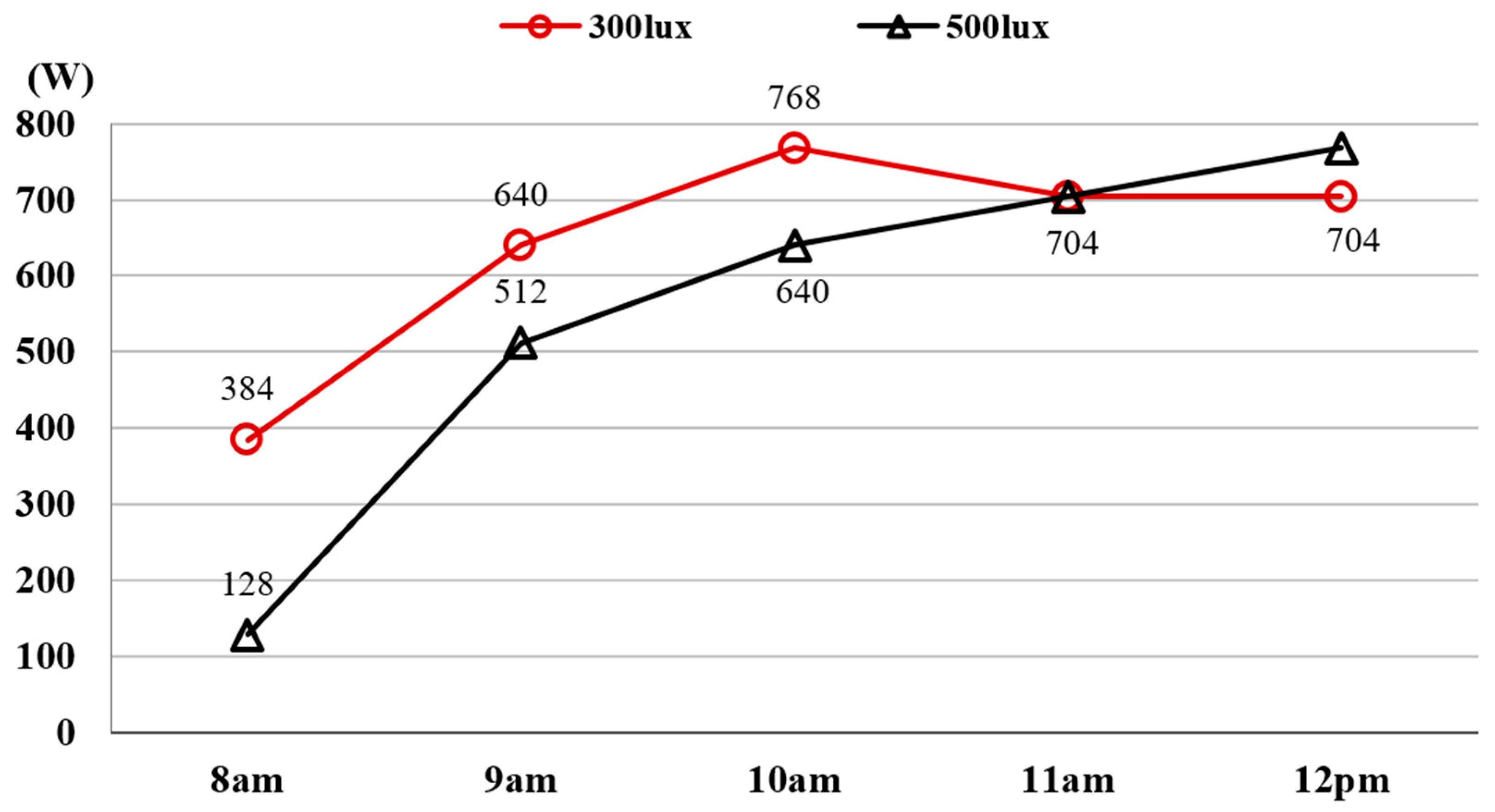 Power consumption (W) according to lighting use after sunlight infringement768640640640704