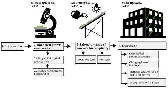 The Present study aims to analyze the biological growth on concrete in the terrestrial environment, considering different scales bioreceptivity evaluation (Figure 1). First, we analyze the biological growth on concrete from the microscopic scale. Next, we highlight the limitations of the currently performed laboratory-scale research. Finally, we discuss the challenges and opportunities of using bioreceptive concrete on a building scale.