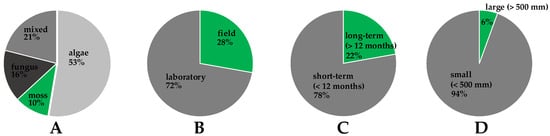 An overview of the laboratory studies related to the bioreceptivity testing of concrete is presented in Table 1. Field studies on concrete bioreceptivity are summarized in Table 2. Due to concrete’s complex and relatively slow biological colonization, simplified and accelerated laboratory tests are commonly employed for bioreceptivity evaluation []. Generally, biological growth is stimulated by inoculating a single species of microorganisms [,,,,,,,,,,]. Using this approach, biological growth may be strictly controlled by applying suitable nutrients and imposing the required temperature, humidity, and UV radiation []. Due to the limitations in time, accelerated laboratory tests are generally performed at intervals of 1–20 weeks, using fast-growing algal microorganisms [,,,,,]. Typically, the biofilm may reach thickness of 20–40 µm over 1–2 weeks under controlled laboratory conditions []. Figure 3 illustrates the current trends in the bioreceptivity analysis, by summarizing data presented in Table 1 and Table 2. It is evident that short-term laboratory studies using single organisms are currently the dominant approach for bioreceptivity evaluation. Nevertheless, studying the growth of individual community members lacks ecological succession and is in sharp contrast to the formation of natural SAB. The natural formation of multiple species biofilms is driven by the external environment, which provides nutrients, moisture, space, and physical and chemical stressors []. As such, complex and highly stratified biological structures form on the surface of concrete, where different species enhance the survivability rate through mutualistic relationships and functional interplay.