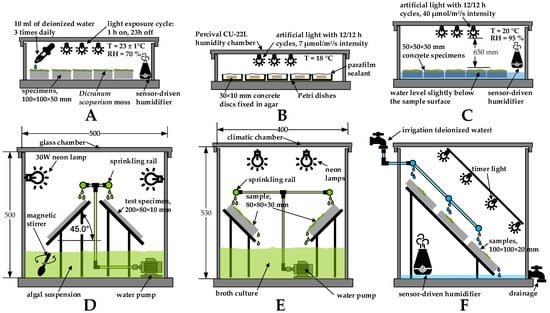 Test arrangements used for concrete bioreceptivity evaluation: (A) adopted from []; (B) adopted from []; (C) adopted from []; (D) adopted from []; (E) adopted from []; (F) adopted from [].