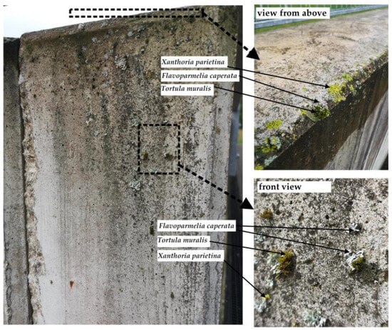 Bioreceptive façades also meet the general public’s need for a larger share of vegetation in the urban environment []. Concrete panels covered with microorganisms, lichens, and lower plants may enrich the biodiversity offering a direct experience of aging nature. When properly designed, bioreceptive concrete façade may fulfill several attributes of biophilic design (presence of plants, natural ecosystems, natural colors, and the patina of time) [].