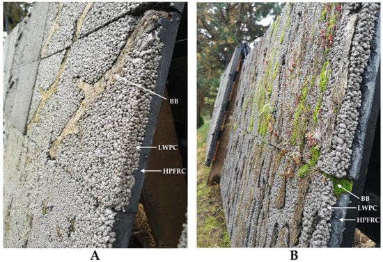 The underlying idea under the development of LLC was to shorten the time required for the natural growth of mosses from several decades to several years. The LLC panel consists of three main elements: (1) high-performance synthetic fiber reinforced concrete (HPFRC) that ensures the durability (the determined resistance to more than 1000 freeze–thaw cycles []) and structural integrity of the panel; (2) light-weight pervious concrete (LWPC), that provides a rough, bio-receptive, and highly permeable surface; (3) biological booster (BB), that directly serves as a growing substrate at the initial colonization stages (Figure 7). Principally, LLC panels may be used in the usual ventilated façades systems as an alternative to the stone, concrete, or fiber cement cladding [,].