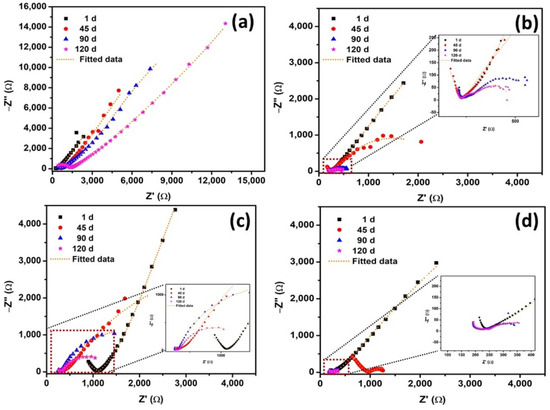 | System | Exposure Time (d) | Rs a (Ω) | ROl b (Ω) | CPEOl | RCT e (Ω) | CPECT | Ceff dl × 10−3 | ||