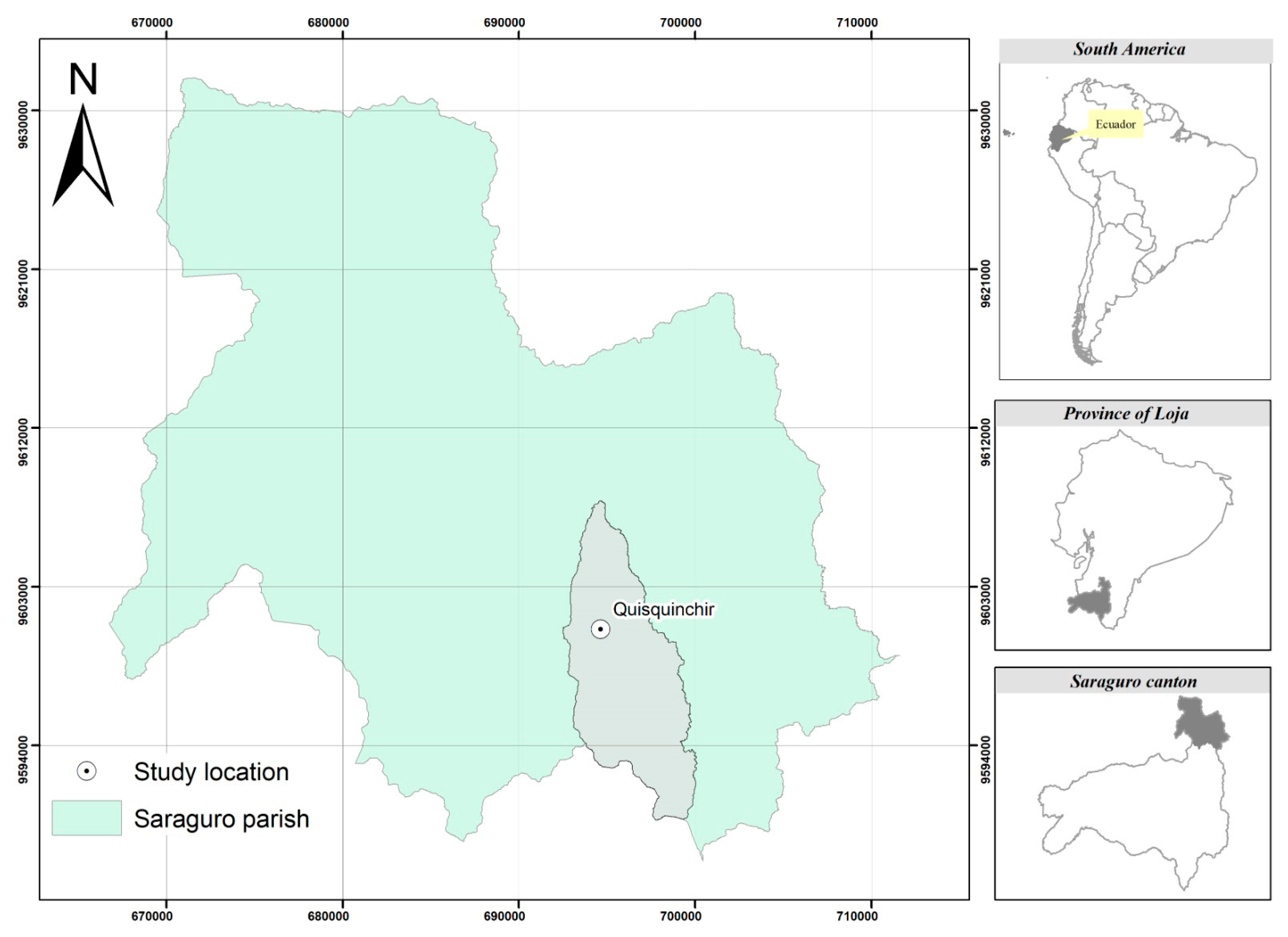 - Municipio de Saraguro. Plan de Desarrollo y Ordenamiento Territorial. Actualización 2024–2030; Municipio de Saraguro: Saraguro, Ecuador, 2024; p. 786. [Google Scholar]