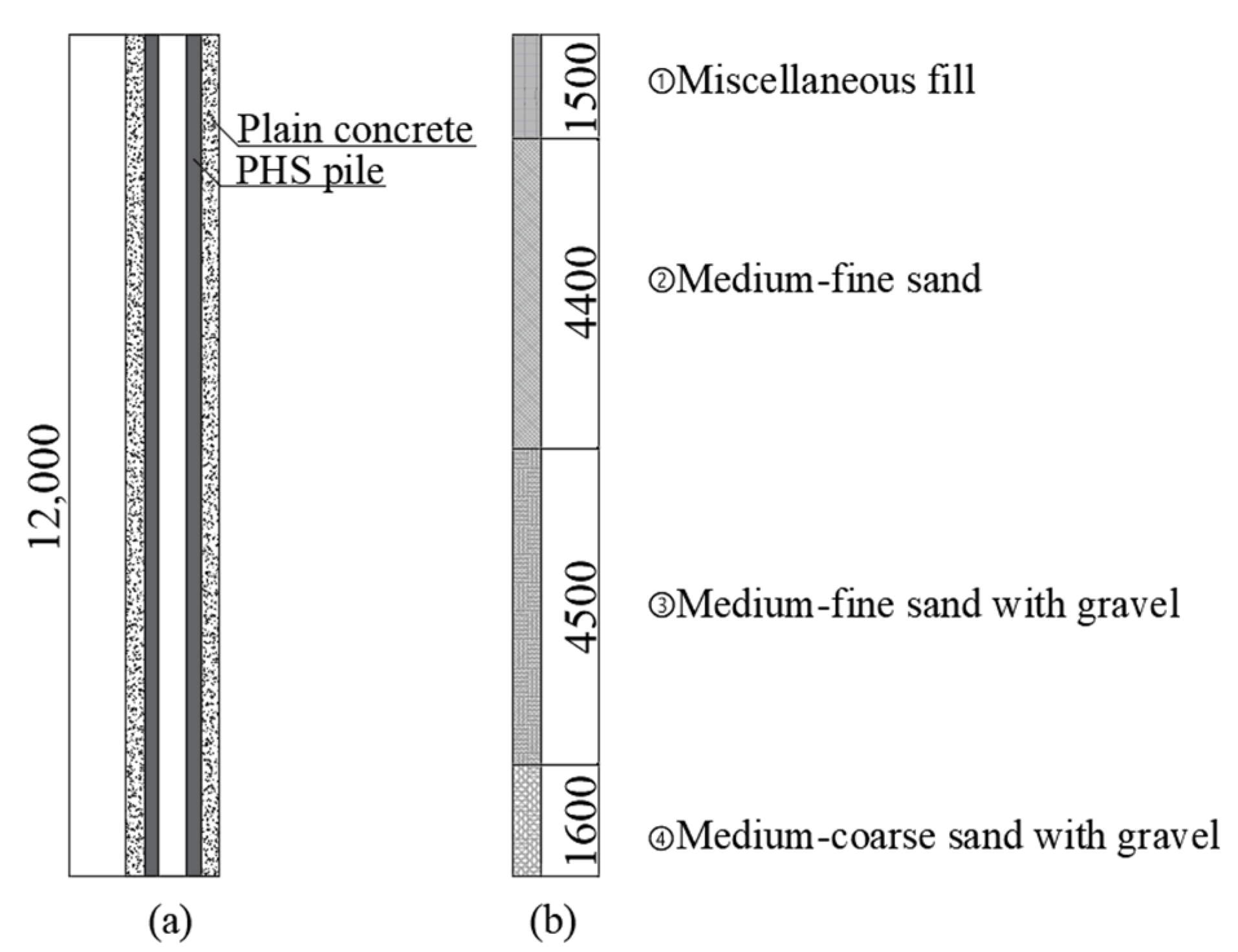 The pile sectional details and the surrounding soil stratigraphy are shown in