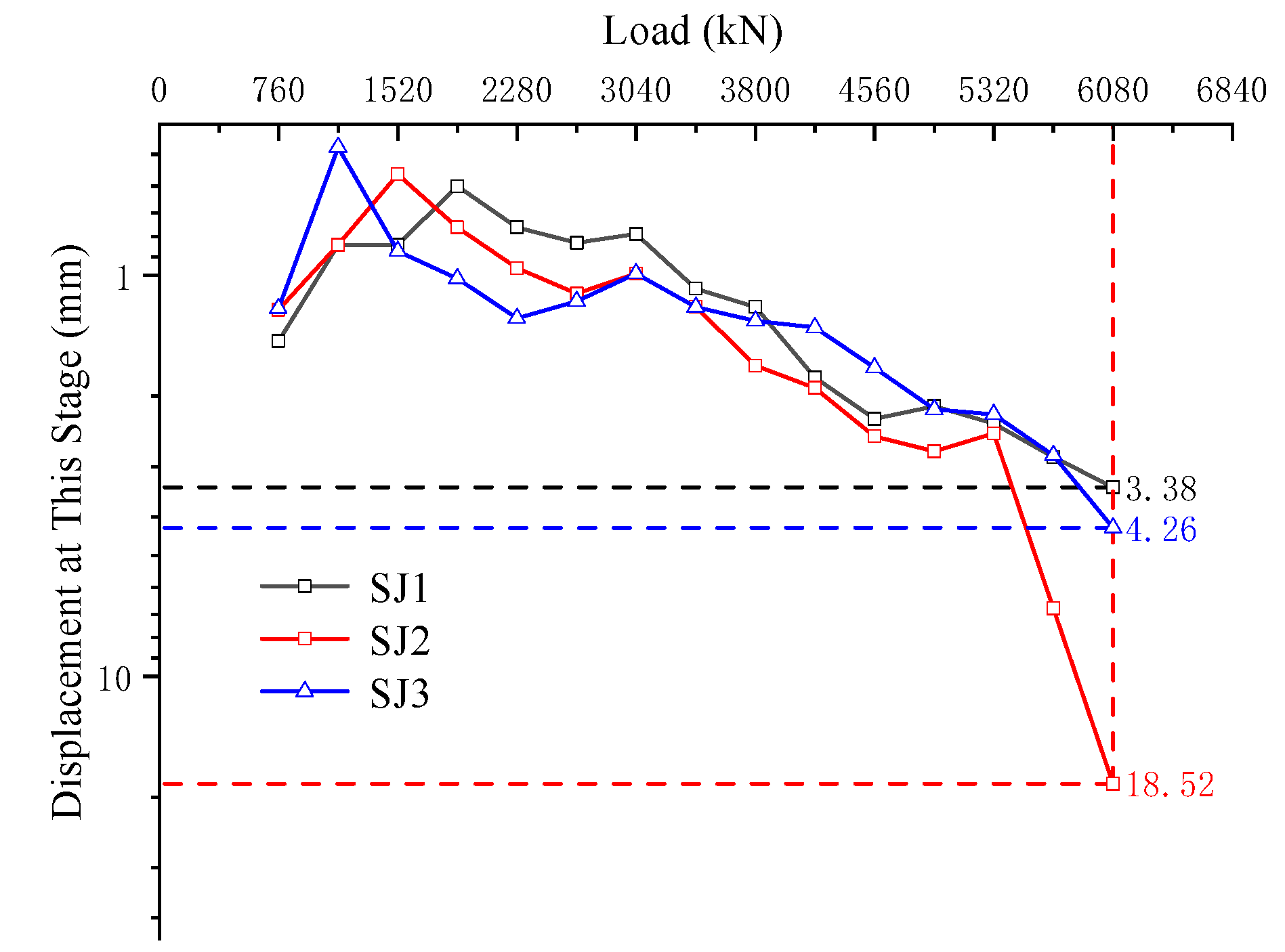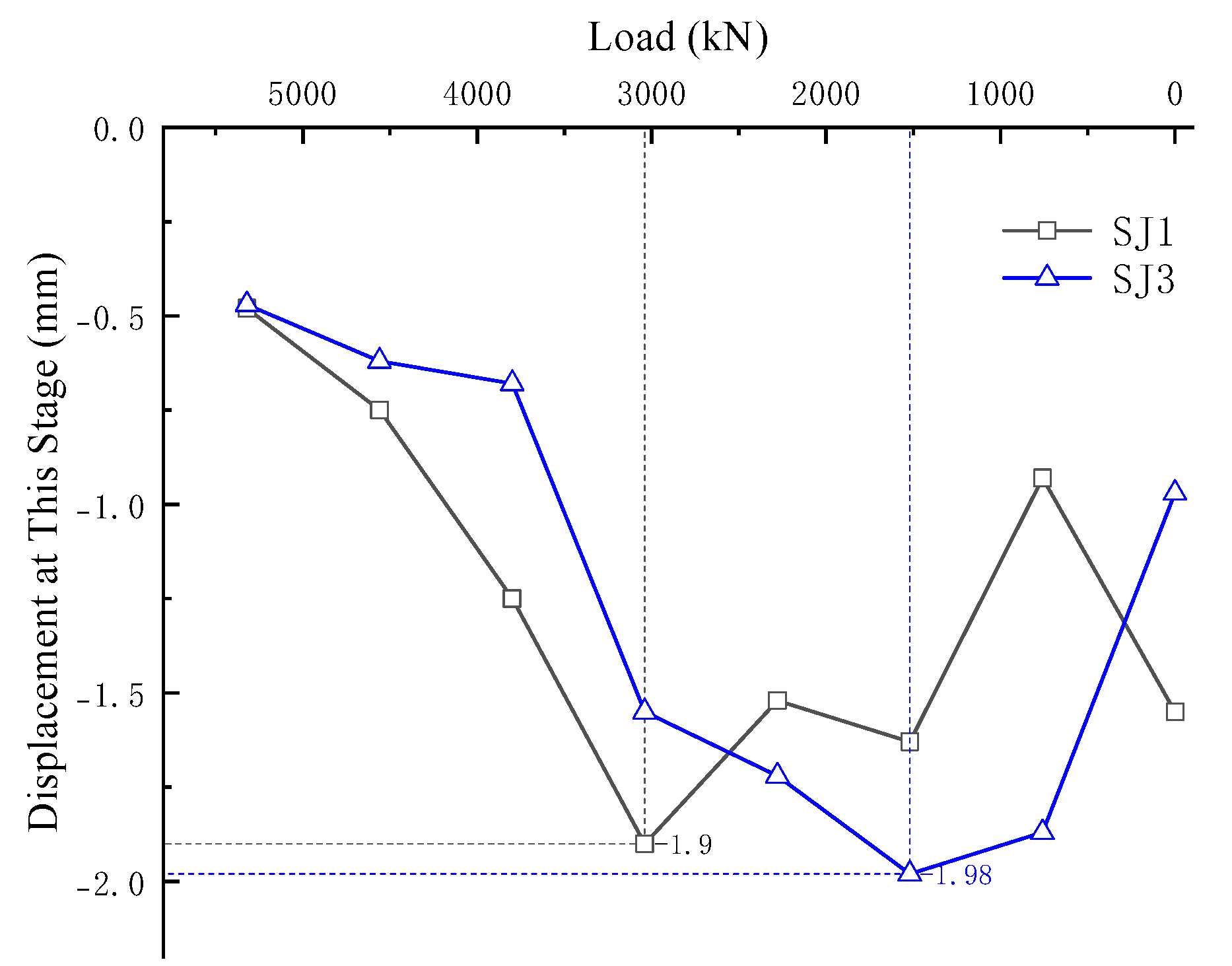SJ3 (unloading): From 5320 to 1520 kN, rebound increased; below 1520 kN, it decreased. The minimum was 0.5 mm (5320 kN) and the maximum 2 mm (1520 kN), a range of 1.5 mm.