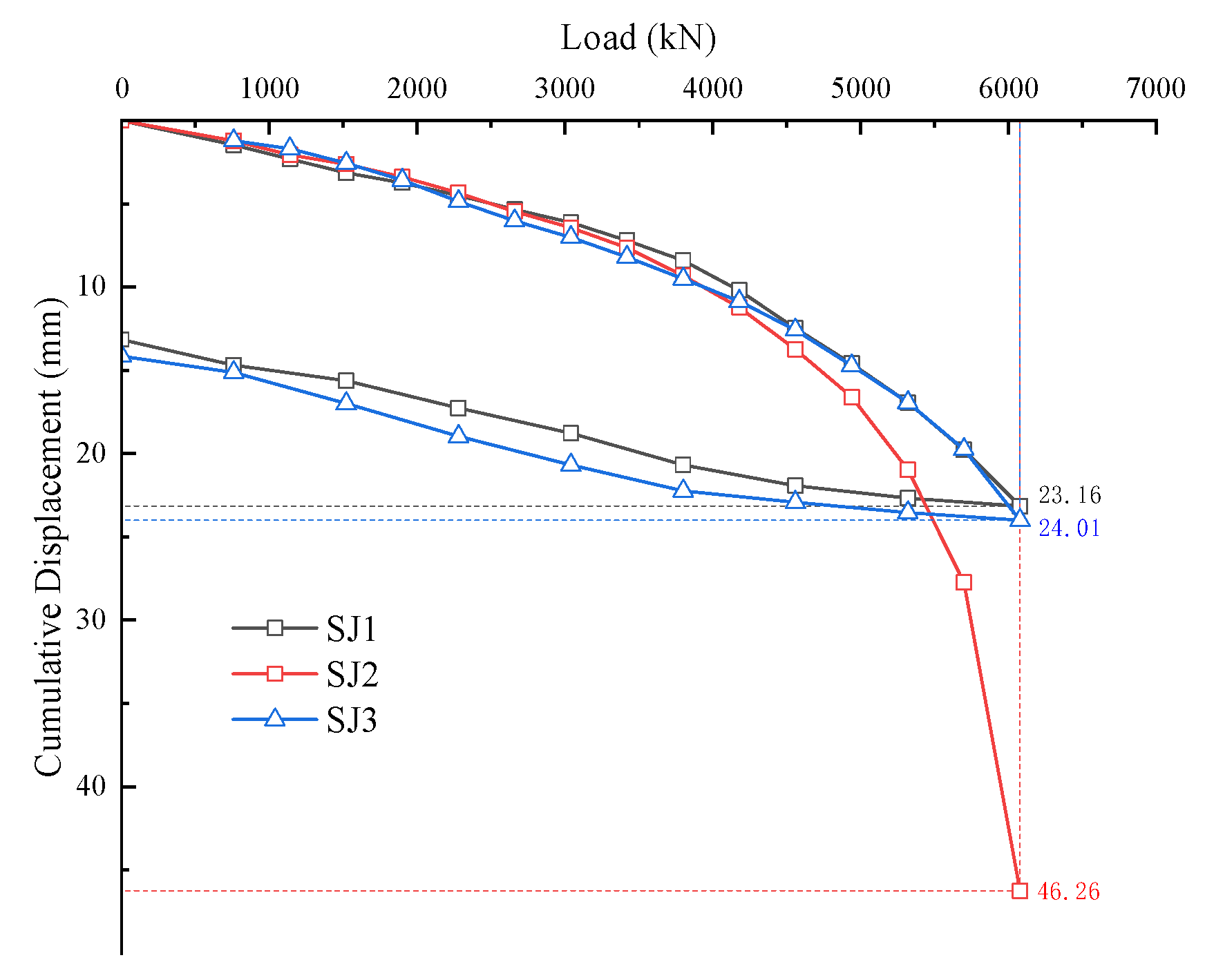 For SJ2, settlement increased smoothly until a sharp rise from 5700 to 6080 kN. At 6080 kN, the maximum settlement reached 46 mm, and the per-step increment exceeded twice that of the previous step; the test was terminated and the ultimate capacity was taken as the previous step (5700 kN).