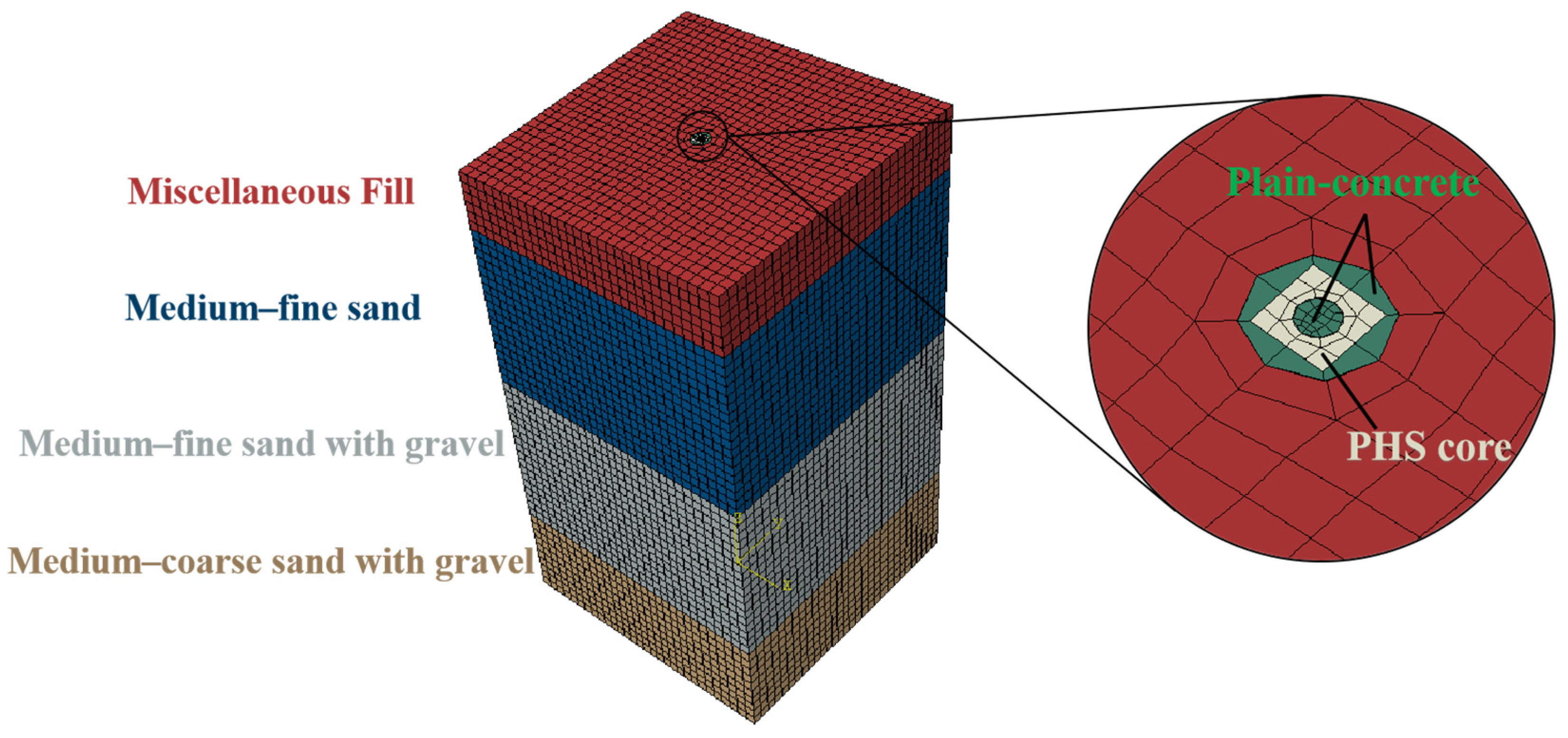 Table 1 before. A surface-to-surface contact scheme was applied at the interface between the core pile and the plain concrete shell. The surrounding soil was modeled using the Mohr–Coulomb constitutive model, while the pile body was modeled as linearly elastic [