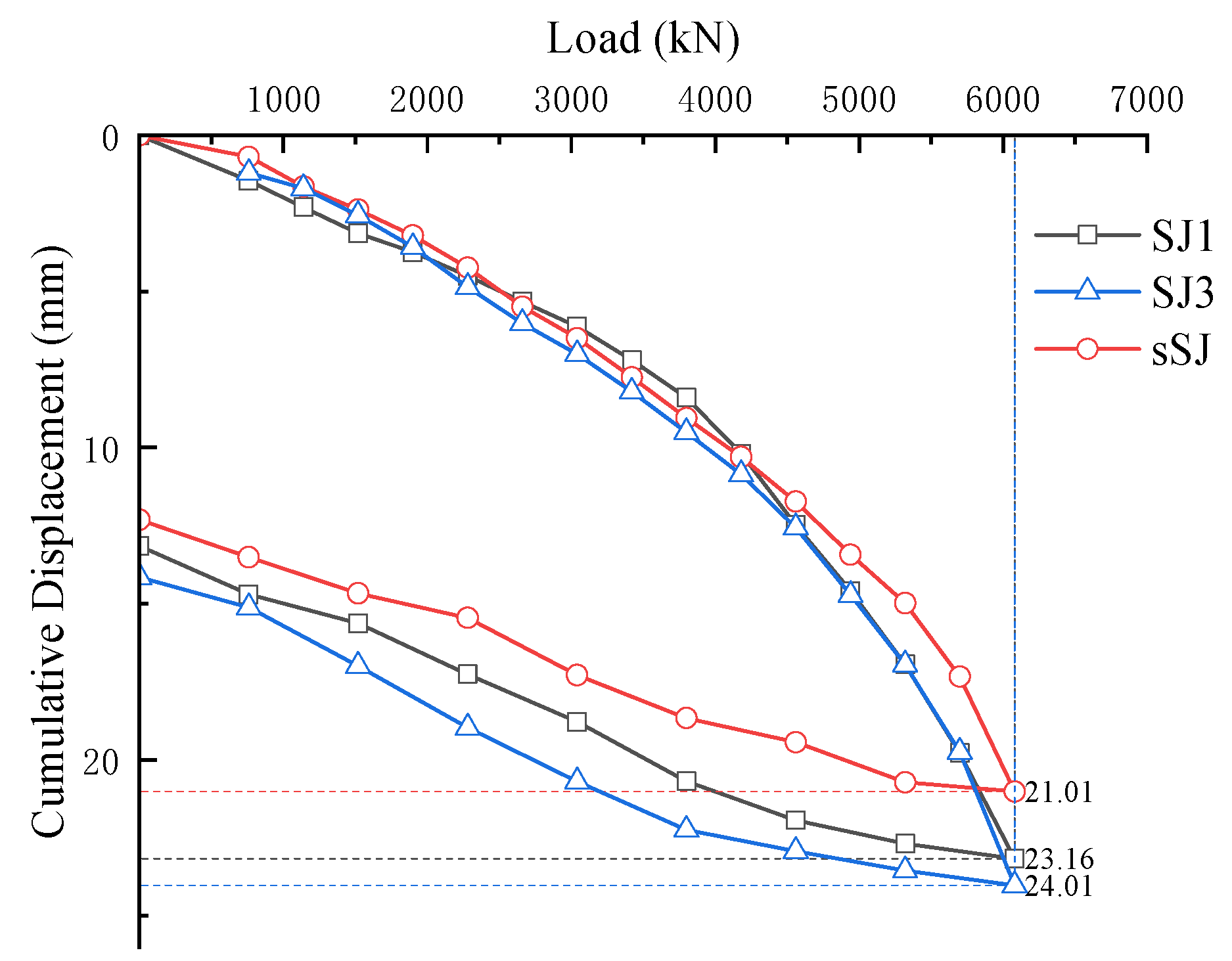 Figure 11, the P–s curves of sSJ and SJ1/SJ3 exhibit consistent overall trends. In the low-load stage (0–4180 kN), settlement increases almost linearly with load, and the curves remain relatively smooth. When the load reaches 4180 kN, the P–s curves gradually assume a parabolic shape, entering the nonlinear growth region, which reflects the progressive approach of both the soil and the pile toward their ultimate states.