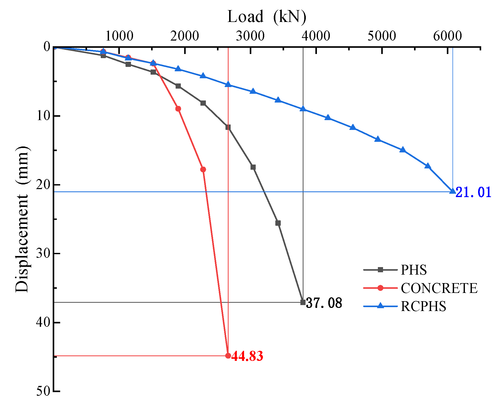 Figure 12 presents the load–displacement curves of piles under different core pile conditions, alongside the standalone PHS pile analysis in