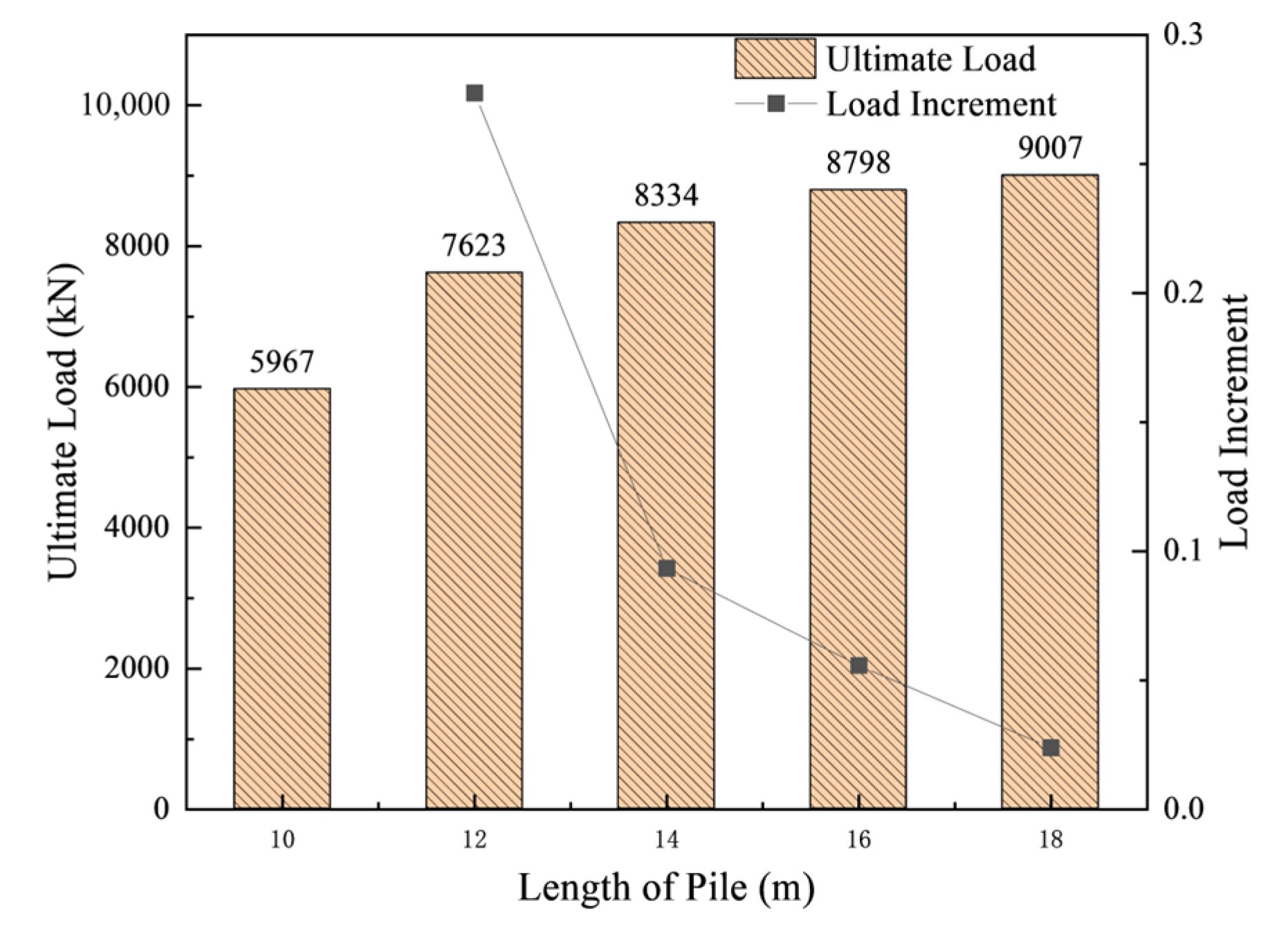 Figure 13, the ultimate bearing capacity of RCPHS piles increases in a stepwise manner with the increase of pile length. Specifically, for pile lengths of 10, 12, 14, 16, and 18 m, the ultimate bearing capacities are 5967, 7623, 8334, 8798, and 9007 kN, respectively, with growth rates of 27.8%, 9.3%, 5.6%, and 2.4%. These results indicate that the enhancement effect of pile length on bearing capacity diminishes as the pile length increases. When the pile length ranges from 10 m to 14 m, the increase in pile length contributes significantly to the ultimate bearing capacity. However, beyond 14 m, the growth rate of bearing capacity gradually slows down. When the pile length reaches 18 m, the improvement effect becomes negligible. Considering that the pile must effectively penetrate weak soil layers and be anchored in stronger bearing strata, as well as construction cost efficiency, a pile length of 12 m is considered optimal.