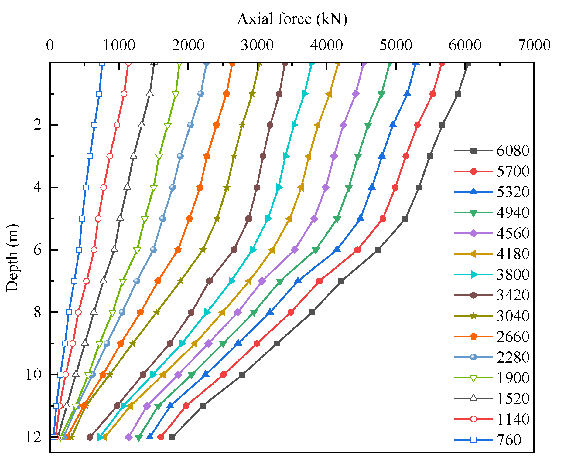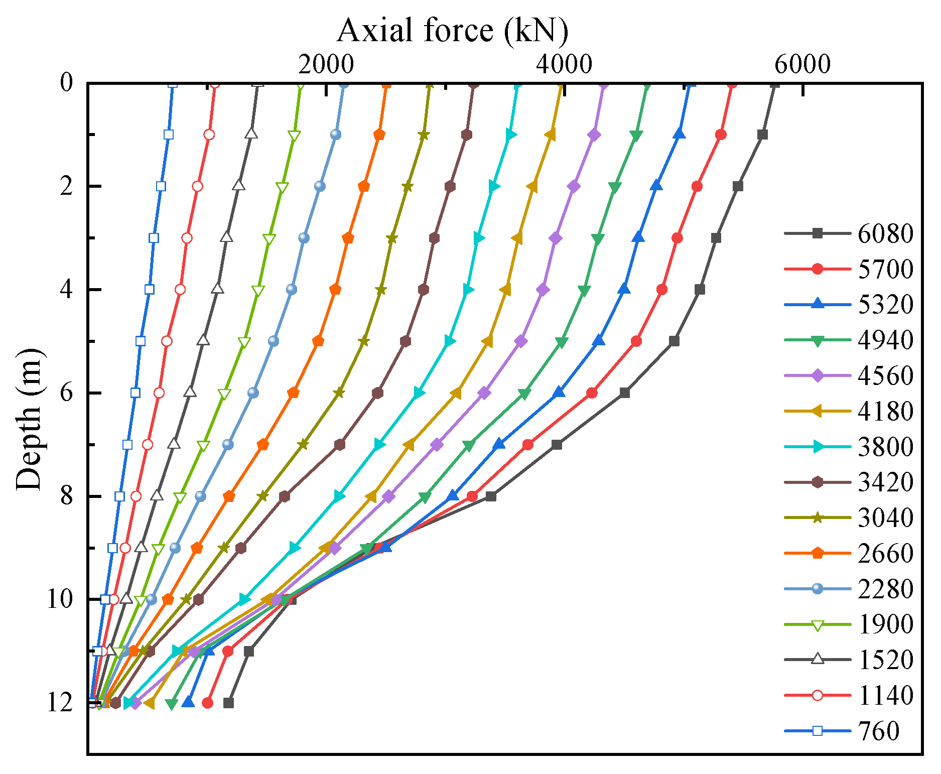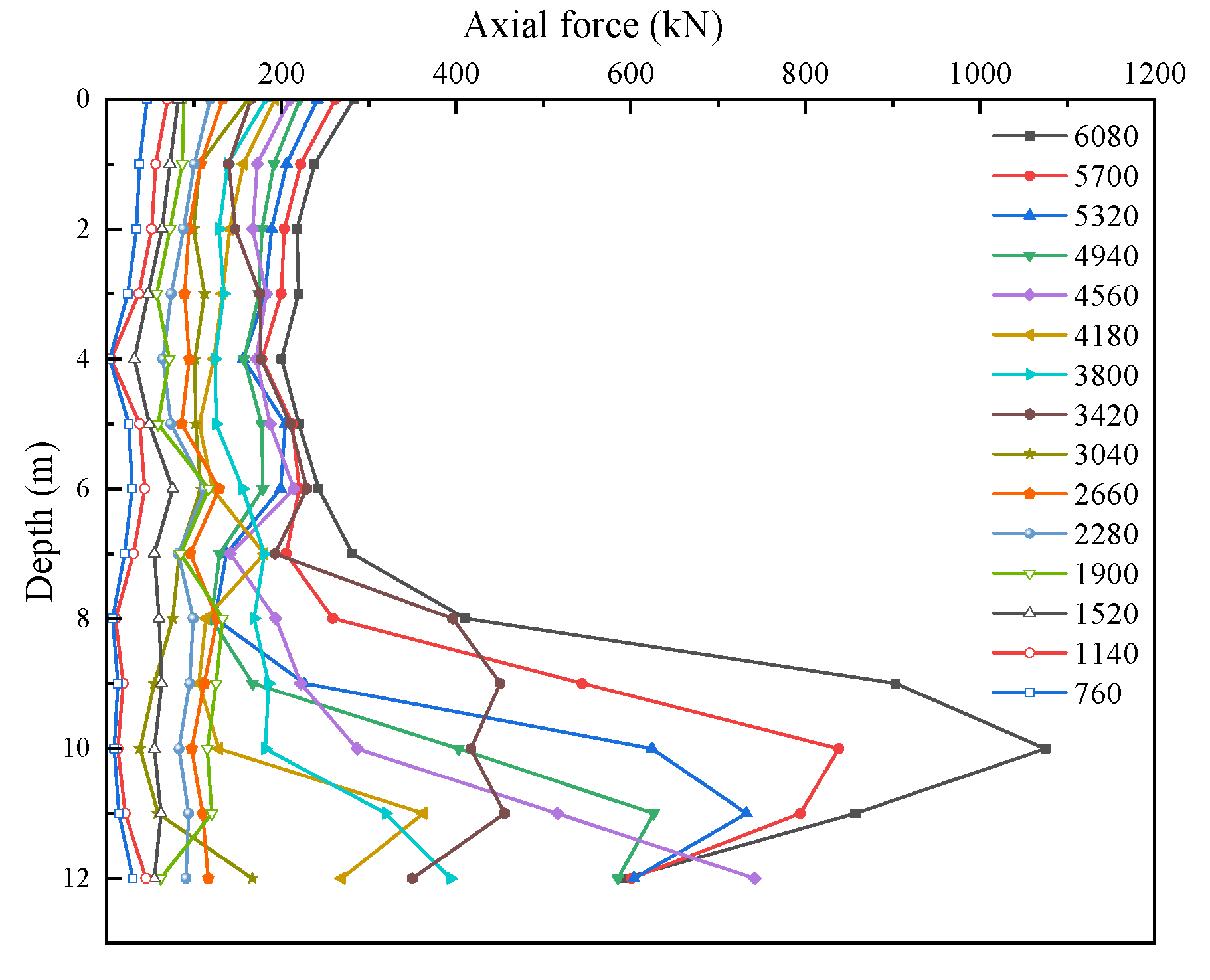 When the pile-head load is below 4180 kN, the axial force distribution of the plain concrete pile shell is characterized by relatively high axial forces at both the top and bottom, with lower values in the middle section. However, once the pile-head load exceeds 4180 kN, the axial force distribution of the pile shell exhibits a more complex variation. Within the depth range of 7–10 m, the axial force increases sharply. This phenomenon is mainly due to the weak soil layers above 6.1 m, which are unable to sustain additional loads, resulting in the load being predominantly transferred to the soil layers below 6 m.