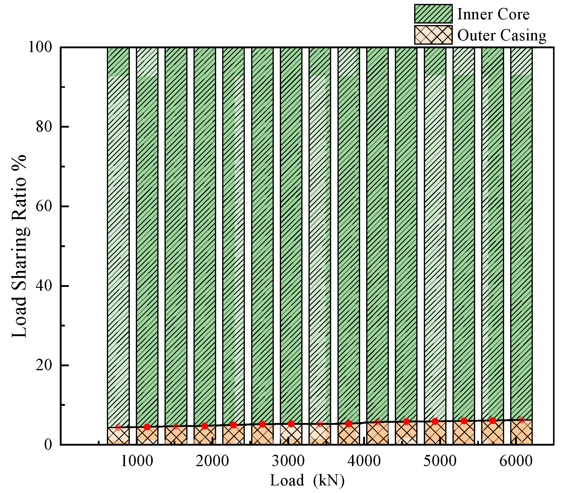 Under vertical loads ranging from 760 kN to 6080 kN, the load-sharing ratios of the core pile and the pile shell are illustrated in