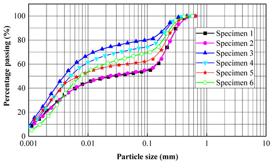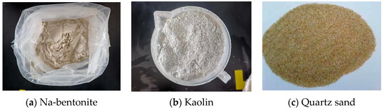 To investigate the adhesion characteristics of different types of clayey soils to the cutter plate and the variation in the adhesion force under different temperatures and moisture contents, laboratory-prepared samples were made using sodium bentonite, kaolin, and quartz sand. The quartz sand was sourced from China ISO standard sand, while the clay was prepared by mixing bentonite and kaolin at different mass ratios. In the prepared samples, the clay-to-sand ratios were set at 20%, 30%, and 40%, respectively, and rotary adhesion tests were conducted accordingly (Figure 1). To ensure test consistency, each experiment was repeated three times. To achieve uniform moisture distribution, the samples were thoroughly mixed, sealed, and stored at room temperature for 24 h. The liquid and plastic limits of the samples were determined using an LP-100D soil liquid–plastic limit tester, further ensuring the consistency in sample properties across tests. The three types of clay samples are summarized in Table 1, and the particle size distribution curve of the samples is shown in Figure 2.
