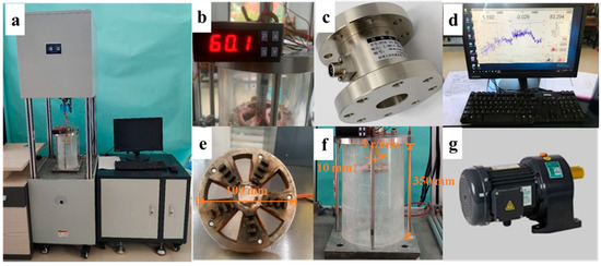(a) Rotary adhesion test system of cutterhead; (b) digital display temperature control device; (c) torque transducer; (d) data acquisition system; (e) temperature-controlled cutterhead; (f) cylindrical soil sample warehouse; (g) rotating motor.