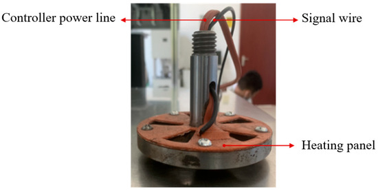 The cutter disk rotary adhesion test system (Figure 3) consists of four main parts: the digging system, the power system, the temperature control system, and the information acquisition system. The self-developed special cutter (Figure 4) diameter is slightly smaller than the inner diameter of the silo, 100 mm, with a cutter thickness of 10 mm in the cutter solid part of the upper part of the heating panel. Temperature sensors were connected to the digital temperature control device through the signal line. The special cutter is fixed in the system of the synchronous rotation and digging of the main shaft. It can simulate the shield tunneling process through cutter rotation, cutter pressurization, and the warming phenomenon. The data of the cutter rotating in the soil sample in the digging process are collected through various sensors, recorded in the data acquisition system, and can be exported for data analysis. Through the torque sensor, the real-time acquisition of the torque changes from the maximum instantaneous torque can be derived according to formula (1), which corresponds to the maximum adhesion force. In the equation, is the interfacial adhesion force, is the instantaneous rotational torque, and is the diameter of the cutter disk.