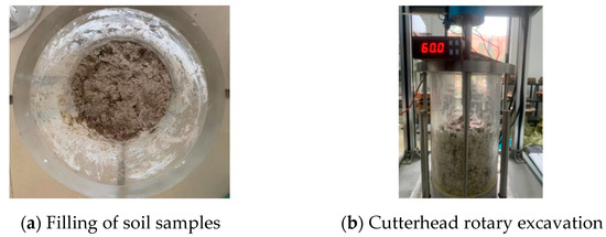 For sample preparation, the soil was placed in layers and compacted to ensure consistent density across all samples. Once the test was complete, the base was lowered, and the cutter and base were returned to their original positions. The soil sample bin was removed, data collection and cleaning were performed, and the next test began. The entire test process is shown in Figure 5.