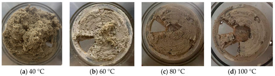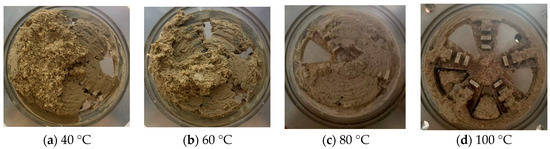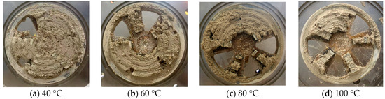 Rotary adhesion tests of the cutterhead were carried out on soil samples with modified proportions of bentonite and kaolin. The moisture content was set at 20%, and the temperatures were controlled at 40 °C, 60 °C, 80 °C, and 100 °C in four groups (see Table 7). The test results are shown in Table 8 and Figure 13.