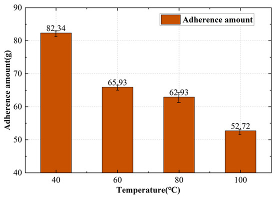 As can be seen from the test results in Table 8 and Figure 13, with the gradual increase in temperature, the overall law is more or less the same: the adhesion force and the amount of adhesion are reduced. However, under the same water content, with the increase in the bentonite content in clay samples within a certain range, the adhesion force slightly increases. In the completely bentonite type, that is, soil sample 6, in the case of a water content of 20% and a cutter temperature from 40 °C to 100 °C, the amount of adhesion is reduced by 27.39%. In the soil sample 5 (Bentonite:Kaolinite = 1:2), as the temperature increases to 100 °C, the amount of clay adhesion is reduced by 47.51%; hence, the relative increase in the bentonite content attenuates the effect of temperature on the adhesion of soil samples with the same water content.