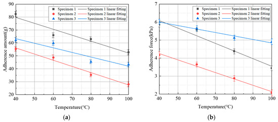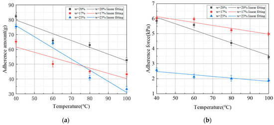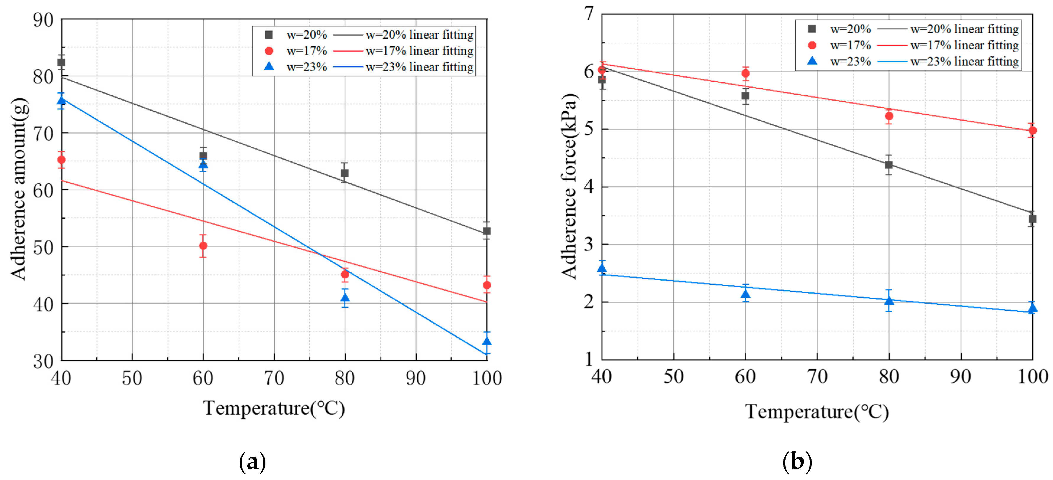 The data points for the amount of adhesion of the cutter disk for different test groups under this soil sample condition showed that the amount of adhesion had a decreasing trend with increasing temperature. Meanwhile, when the ω = 23%, and the temperature of the test cutter was increased from 40 °C to 100 °C, the amount of clay adhered to the cutter surface decreased from 75.49 g to 33.21 g, which was a decrease of 56%. When the ω = 17%, the amount of adhesion decreased from 65.25 g to 43.21 g, which is only 33.78%. Therefore, the high moisture content test group (ω = 23%) was more strongly affected by temperature to the low moisture content (ω = 17%) test group. Linear fitting of the group data points showed that the absolute value of the slope of the fitted straight line was small at 0.356 in the case of low moisture content, and the absolute value of the fitted straight line gradually increased with the increase in the moisture content, which also showed that the clay adhesion effect gradually increased with the temperature, along with the increase in the moisture content. When the water content is higher, and the temperature rises, a water-rich environment enhances the drainage process of the clay block, which has a larger impact on the cutter plate adhesion process, and will also more obviously affect the change in the adhesion force of the adhesion process.