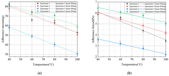 Adhesion of cutter discs with temperature variation for test groups with different water contents. (a) Cutterhead adhesion data and linear fitting. (b) Adhesion force data and linear fitting.