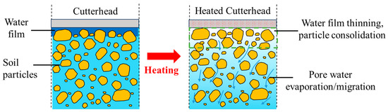 Figure 14 illustrates the adhesion mechanism of the cutterhead under heating. Under normal conditions, a relatively thick water film exists between the cutterhead and the soil particles, providing lubrication and resulting in weaker adhesion. When the cutterhead is heated, the elevated temperature accelerates pore water evaporation and migration. Consequently, the interfacial water film becomes thinner, soil particles consolidate near the cutterhead surface, and a hardened layer begins to develop. This transformation alters the adhesion behavior, as the interface transitions from a lubricated contact to a consolidated mud layer with enhanced adhesion resistance. In addition, due to the weakened bonding capacity of the consolidated clay with the surrounding fresh soil, the overall adhesion mass on the cutterhead surface may decrease, but the formation of localized hardened mud layers enhances the resistance to soil stripping, leading to an increase in the adhesion force between the soil and the cutterhead.