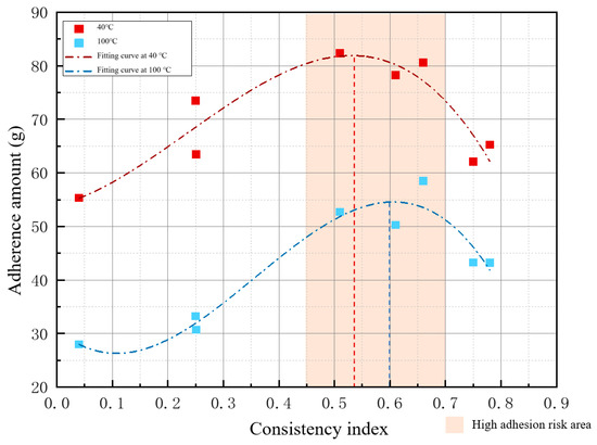 As can be seen from Figure 15, with the increase in the degree index, the clay sample adhesion shows a trend of increasing and then decreasing. The consistency index of 0.5–0.75 interval adhesion is stronger, belonging to the high adhesion risk interval, and the consistency index over 0.75 belongs to the medium adhesion risk interval. The test data in this study basically coincide with the distribution of the above adhesion risk intervals. At the same time, as the temperature rises, the overall adhesion of clay shows a downward trend, but the overall trend of change is the same. By fitting the two sets of adhesion data points, it can be seen that, the consistency index and adhesion are in line with the cubic function of the corresponding relationship at different temperatures; the consistency indices first increase, and then this trend reduces. However, the location of the highest point of the change curve of adhesion under different temperature conditions is slightly different: at 40 °C, the highest point appears at = 0.54 or so, and at 100 °C, the highest point occurs when = 0.6. This is because with the increase in temperature, the high moisture content clay is subjected to a higher temperature, and the adhesion decreases significantly. So, when the temperature increases, the location of the highest amount of adhesion will be moved to the location of the high consistency index.