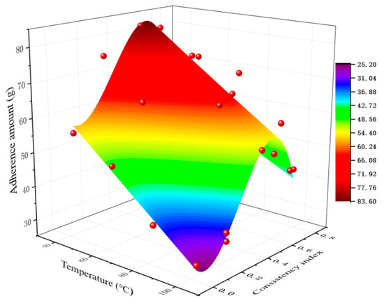 Based on the above findings, all the data points were plotted on a three-dimensional scatter plot and fitted to a three-dimensional surface with R2 = 0.91, as shown in Figure 16. From this, we can obtain the change rule of clay adhesion under the joint influence of the temperature and consistency index, and we can obtain the relationship equation of the change in cutter plate adhesion as Equation (4):