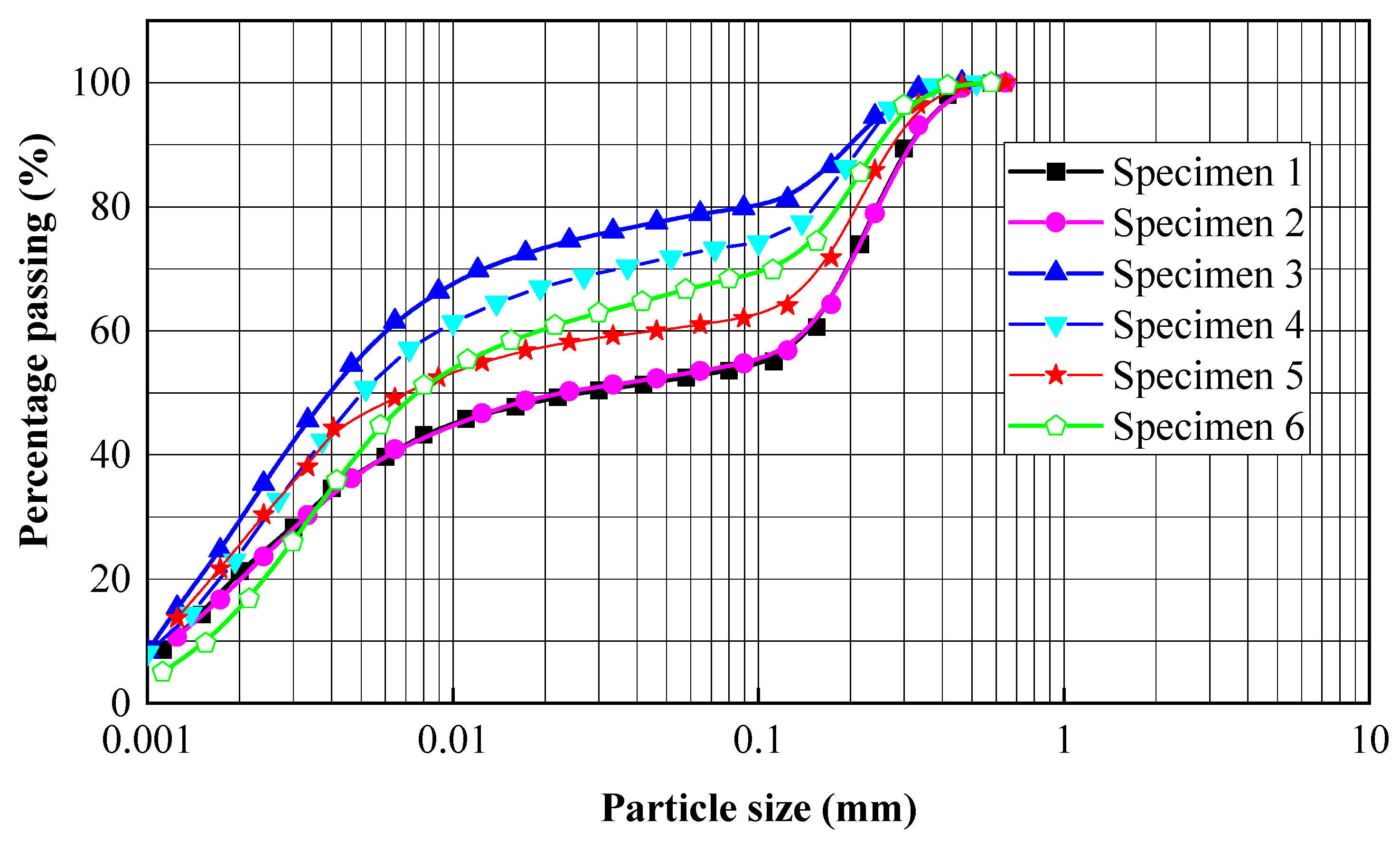 Figure 1). To ensure test consistency, each experiment was repeated three times. To achieve uniform moisture distribution, the samples were thoroughly mixed, sealed, and stored at room temperature for 24 h. The liquid and plastic limits of the samples were determined using an LP-100D soil liquid–plastic limit tester, further ensuring the consistency in sample properties across tests. The three types of clay samples are summarized in