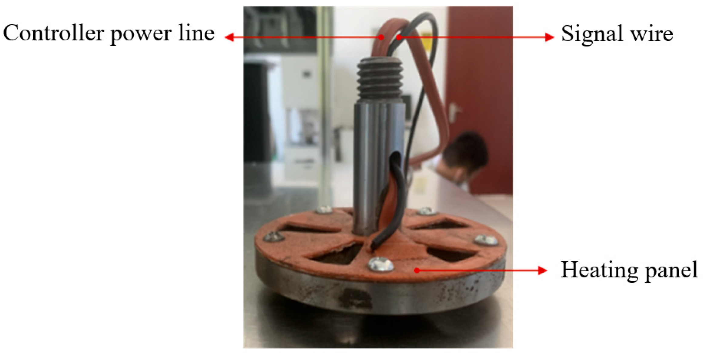 Figure 4) diameter is slightly smaller than the inner diameter of the silo, 100 mm, with a cutter thickness of 10 mm in the cutter solid part of the upper part of the heating panel. Temperature sensors were connected to the digital temperature control device through the signal line. The special cutter is fixed in the system of the synchronous rotation and digging of the main shaft. It can simulate the shield tunneling process through cutter rotation, cutter pressurization, and the warming phenomenon. The data of the cutter rotating in the soil sample in the digging process are collected through various sensors, recorded in the data acquisition system, and can be exported for data analysis. Through the torque sensor, the real-time acquisition of the torque changes from the maximum instantaneous torque can be derived according to formula (1), which corresponds to the maximum adhesion force. In the equation,