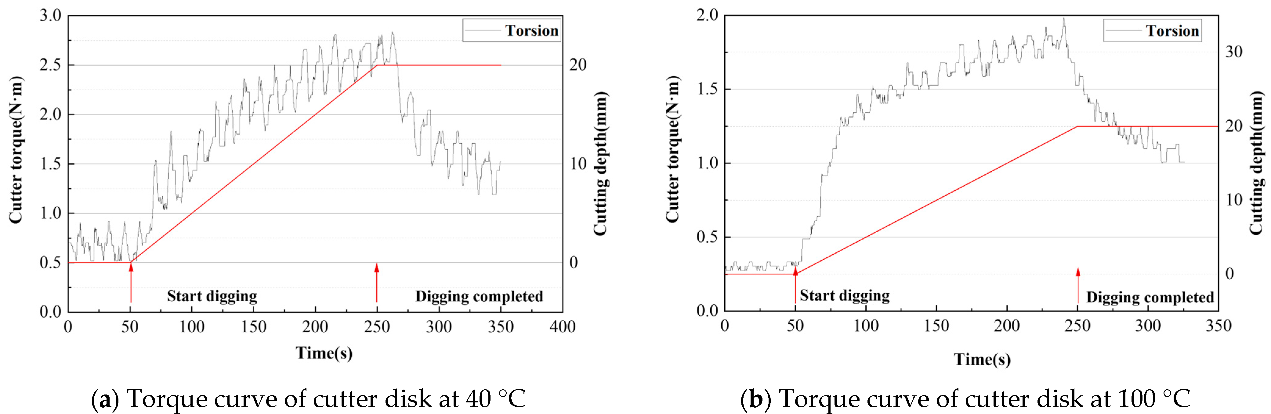 The temperature of the cutter disk is controlled via a digital temperature controller, which monitors the temperature in real-time. The cutter disk was heated until it reached the set temperature, and if the temperature dropped by more than 5 °C, the heating was adjusted to maintain a stable temperature range. After pre-loading and pre-heating, the cutter’s rotational speed was set to 5 r/min and the base lifting speed to 0.1 mm/s, for a total lifting distance of 20 mm, followed by data acquisition. After the test, the data were saved and exported.