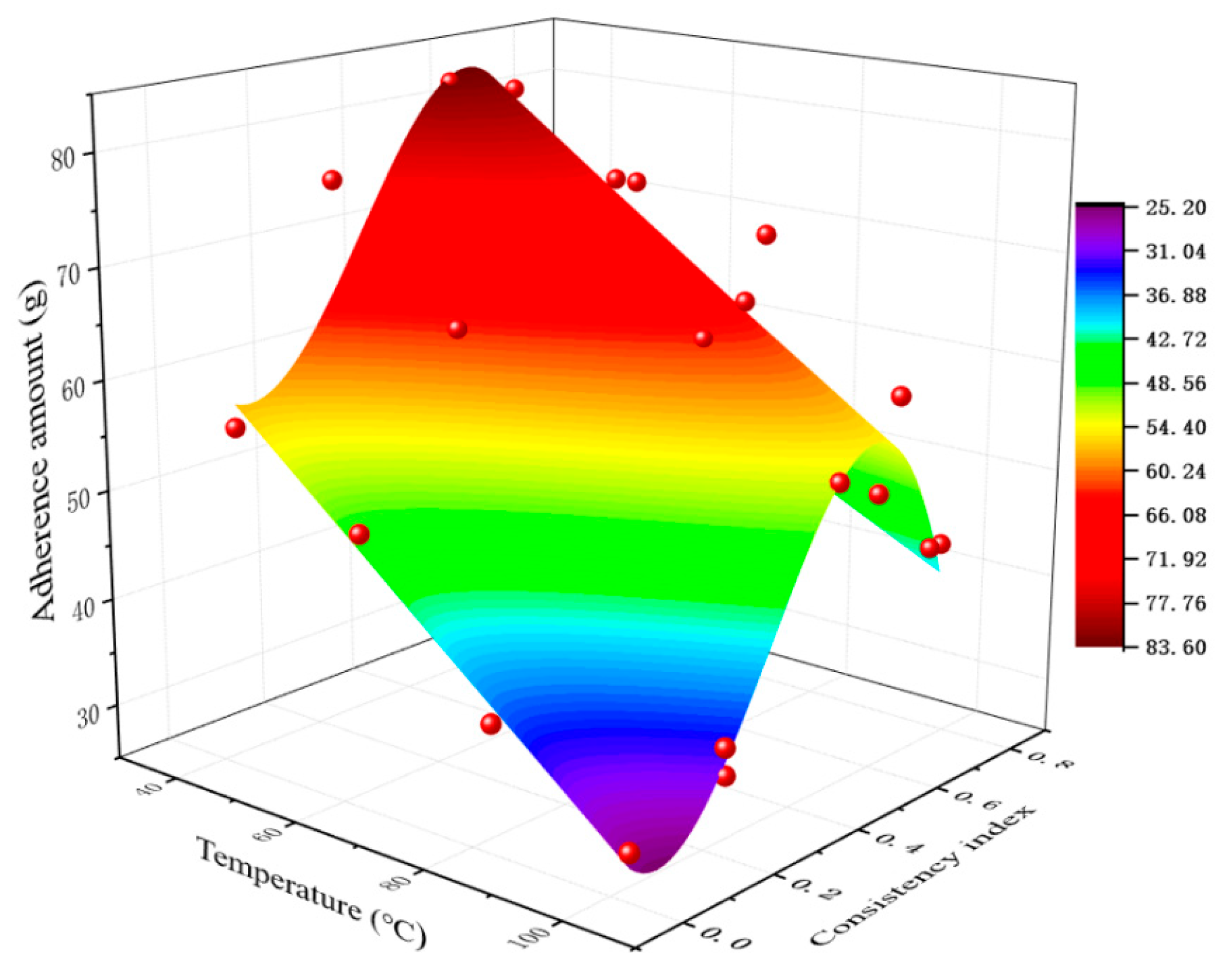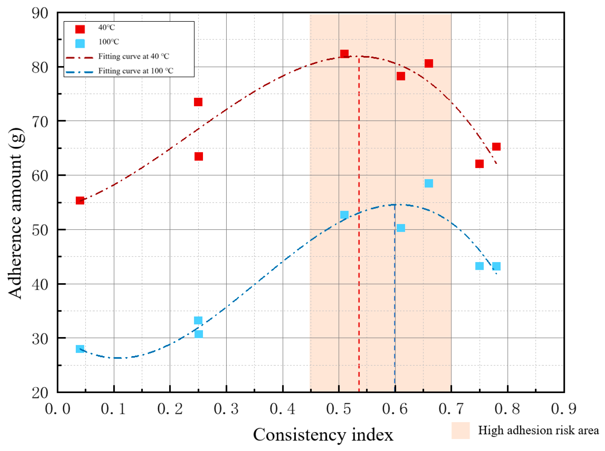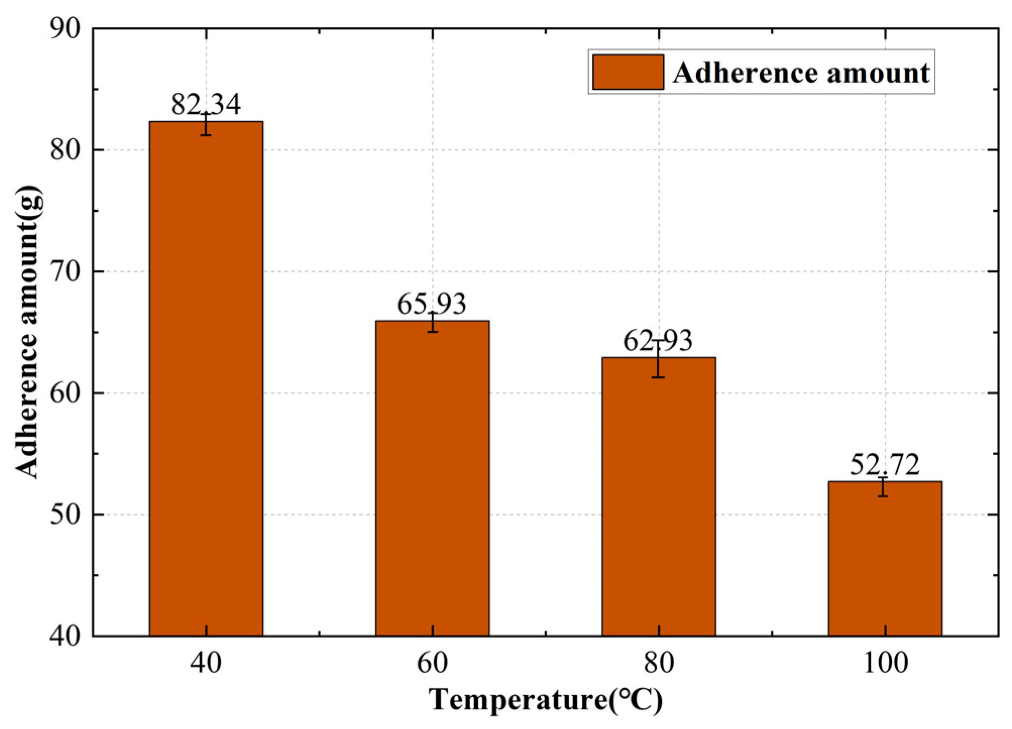 Table 5), with different clay contents, respectively, using the knife and disk rotary adhesion test, with the temperature set to 40 °C, 60 °C, 80 °C, and 100 °C for four groups. The test results are shown in
