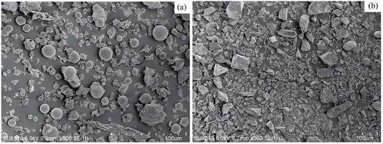 The fly ash used in this study is classified as low-calcium fly ash, with a calcium oxide (CaO) content of less than 10 wt. %. The slag is obtained from the by-products of pig iron smelting, specifically molten furnace slag that has been cooled and ground. Their apparent morphologies are illustrated in Figure 1. Microscopic observation reveals that the fly ash particles are predominantly spherical in shape, characterized by smooth and dense surfaces, which is typical of the rapid cooling and solidification of mineral matter during coal combustion. In contrast, the slag exhibits a markedly different appearance. It is composed mainly of irregular, angular particles with rough and uneven surfaces.