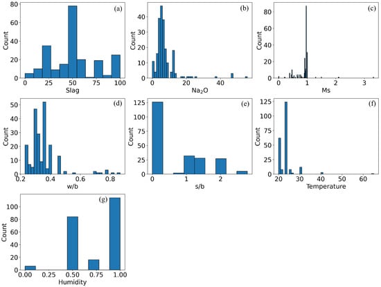 Data distribution of the 7 input variables: (a) Slag (%), (b) Na2O (%), (c) Ms, (d) w/b, (e) s/b, (f) Temperature (°C), (g) Humidity (%).