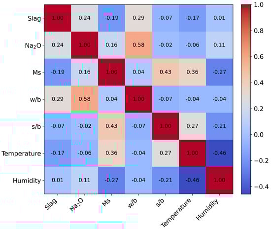 Figure 4 shows the Pearson correlation coefficients among the 7 input variables. The correlation coefficients indicate that most variable pairs show weak or only moderate relationships (). The strongest positive correlation is observed between Na2O dosage and the water-to-binder ratio (), followed by moderate correlations between Ms and s/b () and between Ms and Temperature (). On the other hand, the most pronounced negative correlation is found between Humidity and Temperature (). Overall, the correlations are relatively low, suggesting that no severe multicollinearity exists among the input variables. This finding is important because high collinearity can obscure the contribution of individual variables in machine learning models and reduce their generalization performance. Since the observed correlation levels remain within acceptable ranges, all seven variables (slag content, Na2O dosage, activator modulus Ms, water-to-binder ratio, sand-to-binder ratio, curing temperature, and curing humidity) can be retained as independent input features for subsequent modeling without the need for dimensionality reduction or variable elimination.