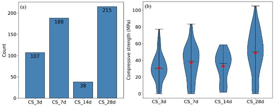 As for the target variables, it should be noted that not all target variables were measured in the 220 records. As illustrated in Figure 5a, in most cases, only a subset of the targets was available: 107 experiments reported compressive strength at 3 days, 188 experiments included compressive strength at 7 days, 38 experiments provided compressive strength at 14 days, and 215 experiments recorded compressive strength at 28 days. Figure 5b illustrates the distributions of four target variables, including compressive strength at different curing ages (3-day, 7-day, 14-day, 28-day). The red dot denotes the median. Compressive strength increases with curing age, with mean values of 30.83 MPa (CS_3d), 37.35 MPa (CS_7d), 33.04 MPa (CS_14d), and 48.90 MPa (CS_28d). CS_28d exhibits the largest variation. Noted that appears lower than others. This anomaly is attributed to the small number of available 14-day strength data points in the dataset rather than an actual reduction in compressive strength at 14 days.