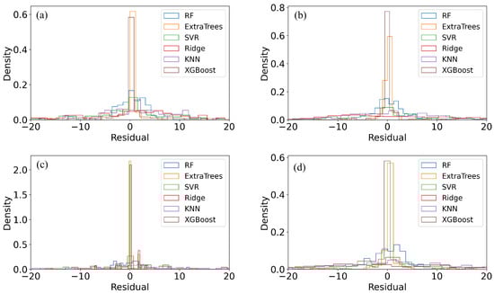 The residual distribution of the 6 prediction model: (a) CS_3d, (b) CS_7d, (c) CS_14d, (d) CS_28d.