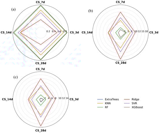 Table 2 illustrates the detail evaluation metrics , RMSE, and MAE of all prediction models including KNN, RF, Ridge, SVR, and XGBoost for the compressive strengths at 3-day, 7-day, 14-day, and 28-day. As have been discussed in the result section, XGBoost and ExtraTrees have the best performance. Ridge exhibits the worst performance.