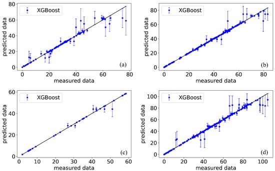As XGBoost achieved the top performance across targets (see Figure 6 and Figure 7 and Table 2), we use XGBoost as the primary interpretation model. Figure 8 illustrates the predicted versus measured data from the best-performing XGBoost model. In the measured–predicted plots, points are shown for the best-performing XGBoost model with vertical error bars representing absolute residuals. Visual alignment of points along the line and uniformly short error bars across the range suggest low bias and variance for XGBoost on all four targets. Occasional departures from the diagonal indicate localized regimes where the function is more complex or sparsely sampled, motivating subsequent feature-attribution analysis.