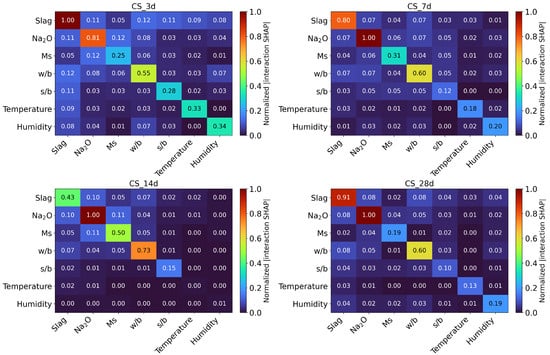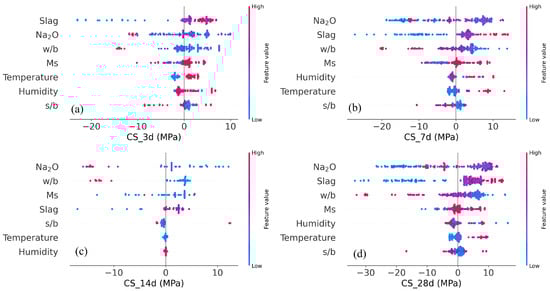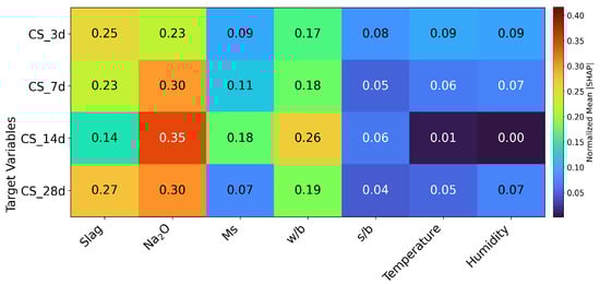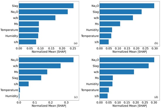 Figure 9 illustrates the normalized feature importance for the four target variables. For the 3-day compressive strength CS_3d, the normalized importance of Slag = 0.25 (highest), Na2O = 0.23, w/b = 0.17, Ms = 0.09, s/b = 0.08, Temperature = 0.09, Humidity = 0.09. Thus, Slag governs the 3 d response—consistent with Ca-rich slag supplying to rapidly form C–(N)–A–S–H; sufficient Na2O ensures high pH and soluble silicate to drive dissolution/gelation, while w/b controls porosity and ion transport. For the 7-day compressive strength CS_7d, Na2O = 0.30 > Slag = 0.23 > w/b = 0.18 By mid-early age, the alkalinity/soluble-silicate supply becomes the dominant rate controller for dissolution and gel growth. For the 14-day compressive strength CS_14d, Na2O = 0.35 > w/b = 0.26 > Ms = 0.18 (Slag = 0.14, s/b = 0.06, Temperature = 0.01, Humidity = 0.00). The reaction remains alkalinity-driven, with the alkali-activated reaction of the aluminosilicate precursor entering a steady stage, while the w/b exerts an indirect and sustained influence on late-age strength by determining the initial structural compactness. For the 28-day compressive strength CS_28d, Na2O = 0.30 and Slag = 0.27 are the top two; w/b = 0.19 (Ms = 0.07, s/b = 0.04, Temperature = 0.05, Humidity = 0.07). Late-age strength is capped by slag-derived Ca enabling denser C–(N)–A–S–H networks, while adequate Na2O ensures earlier-age reaction completion to unlock that potential.