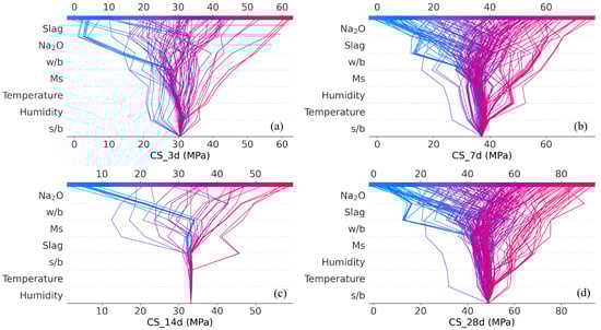 As shown in Figure 10, across all outputs, the first four inputs—Slag, Na2O, Ms, and w/b—consistently dominate, while s/b, Temperature, and Humidity remain secondary. The combined shares of the first four are CS_3d = 0.74, CS_7d = 0.82, CS_14d = 0.93, and CS_28d = 0.83. In contrast, the last three sum to 0.26, 0.18, 0.07, 0.16, and 0.17, respectively. Mechanistically, this reflects that mix/chemistry controllers (Na2O and Ms for alkalinity/soluble silicate; Slag for Ca supply/gel yield; w/b for pore structure and transport) govern the reaction and microstructure, whereas s/b and ambient factors only weakly perturb performance within the tested ranges. This may also be attributed to two factors: first, siliceous sand is an inert material that does not participate in chemical reactions; second, the curing temperature and humidity data exhibit a relatively concentrated distribution (temperature: 20–30 °C; humidity: 50%, 75% and 100%), which limits their observable impact within the tested ranges. In addition, the weak sensitivity of s/b may partly reflect the limited experimental variation of this parameter: as shown in Figure 3e, its values are concentrated around a few discrete peaks, which constrains the model’s ability to capture potential indirect effects such as changes in packing density or water distribution. The leading factors evolve with age: at CS_3d, slag = 0.25 is the largest share (Na2O = 0.23, w/b = 0.17, Ms = 0.09), consistent with Ca-rich slag rapidly forming C–(N)–A–S–H; by CS_7d and CS_14d, Na2O leads (0.30 and 0.35) as alkalinity/soluble-silicate supply controls dissolution–gelation, with w/b strengthening its role at 14-day (0.26) and Ms = 0.18 indicating a modulus window. At CS_28d, Slag = 0.27 and Na2O = 0.30 jointly cap the attainable strength, with w/b = 0.19 continuing to shape porosity.